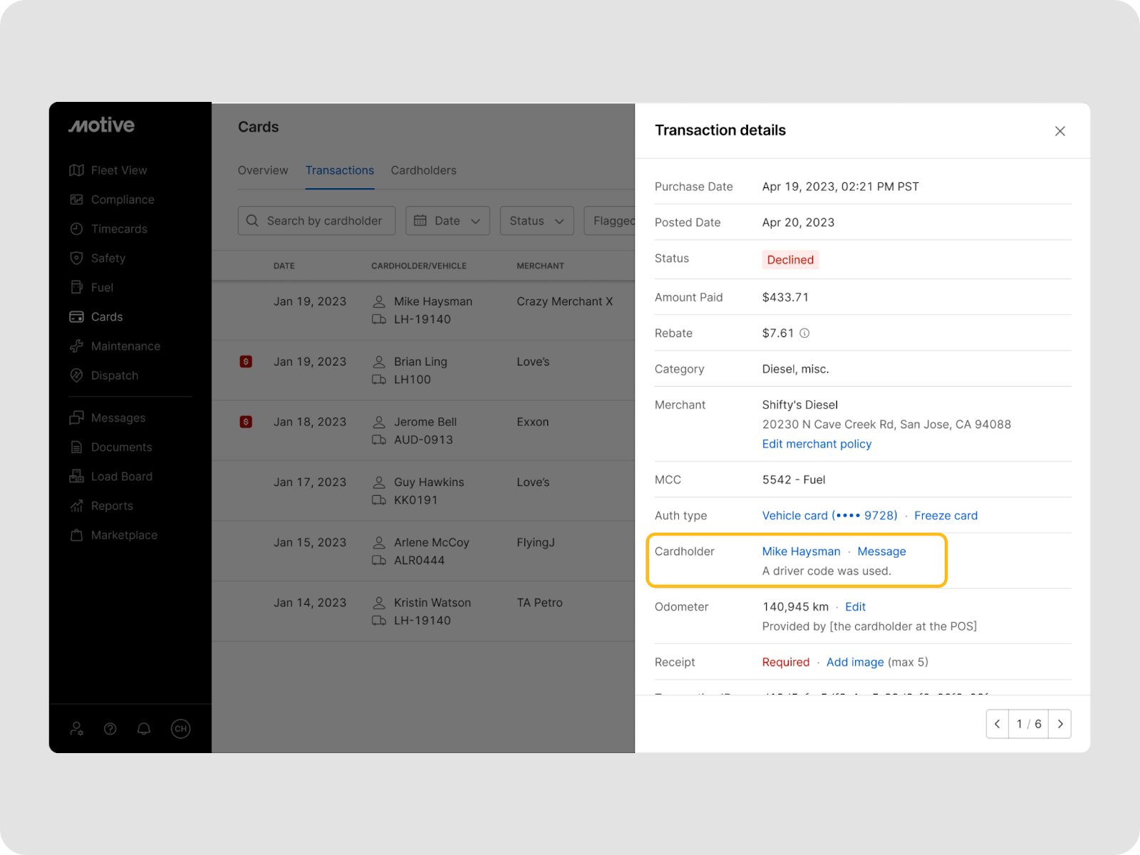 - Log in to the Motive Fleet Dashboard and go to Card > Transactions.