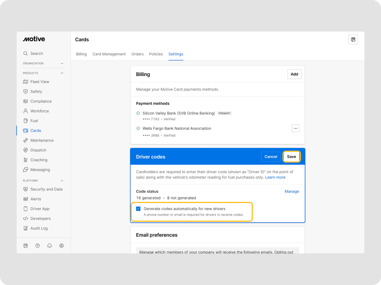 - Alternatively, fleet managers can set up driver codes to be automatically generated for new drivers through the admin card menu by going to Driver Codes > Edit and marking the checkbox for Generate codes automatically for new drivers > Save.