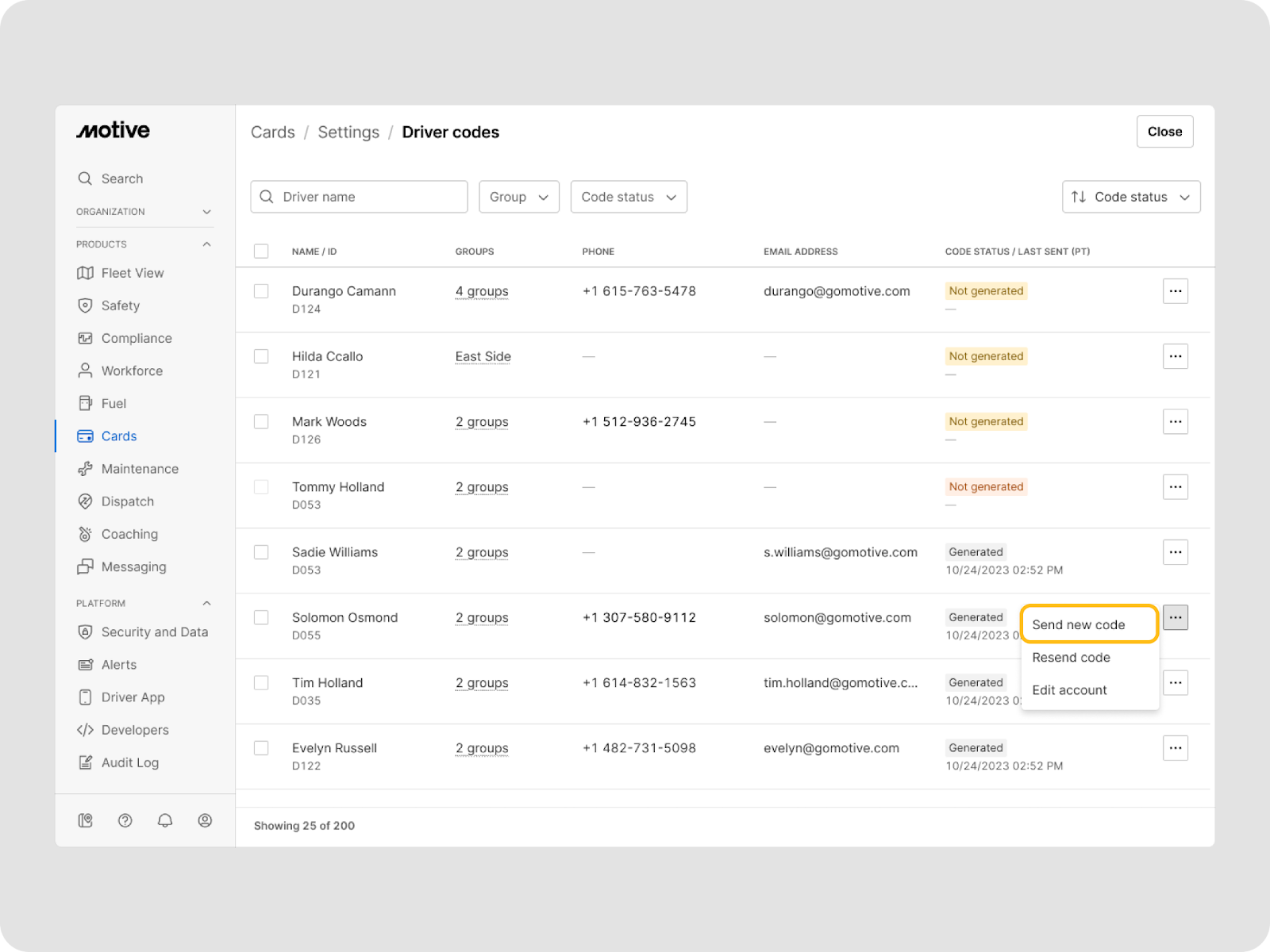 - Mark the checkbox for drivers with the code status as Not generated and click Send new codes.