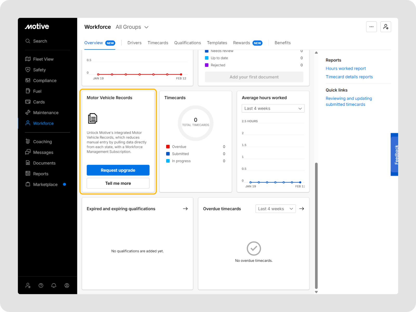 - Motor Vehicle Records (MVR) section on the free tier dashboard showcases Motive’s integrated MVR capabilities, which reduce manual entry by pulling data directly from each state and are available to customers with a WFM subscription.