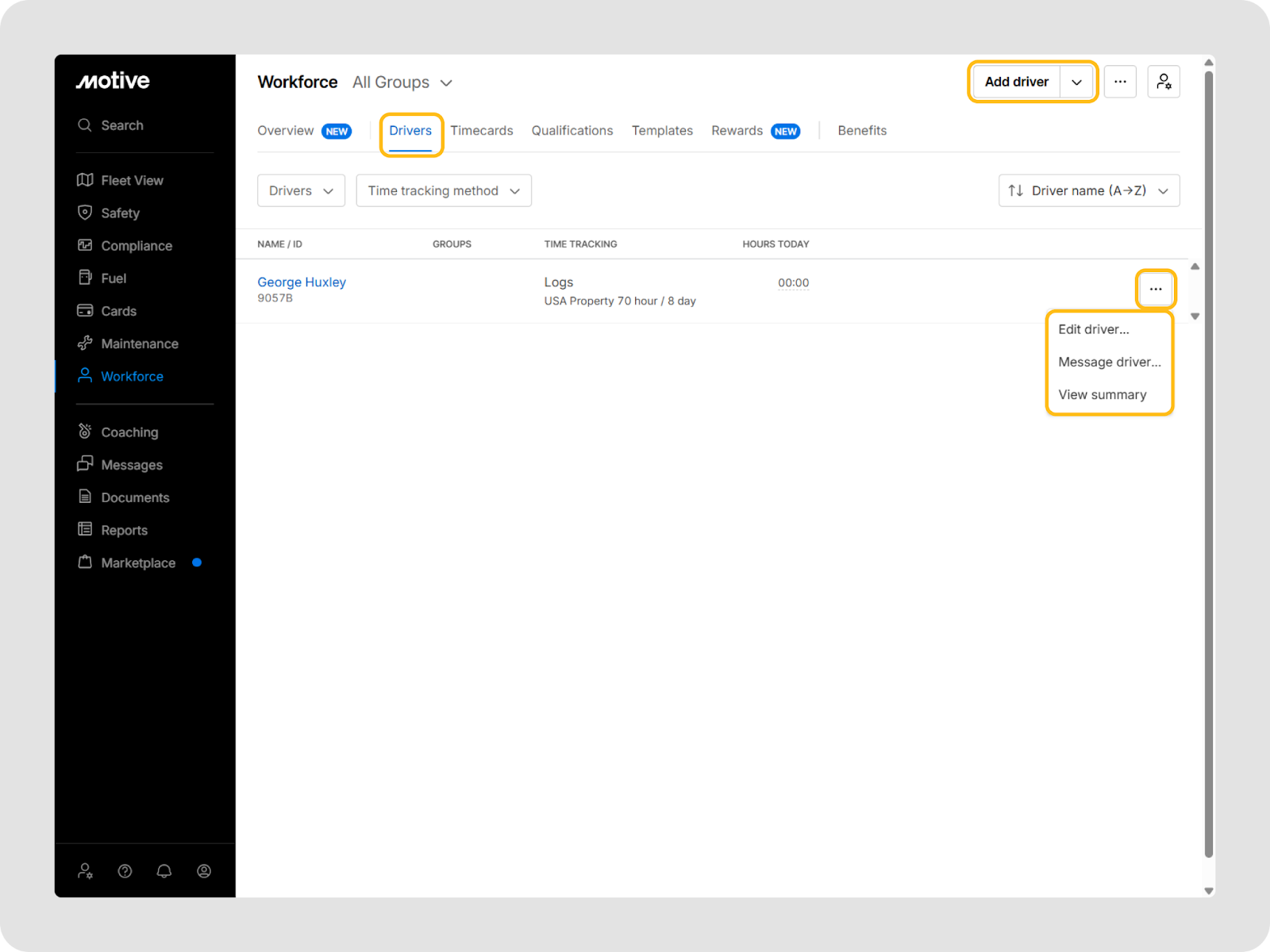 - Click the three-dot menu to edit the driver profile, message the driver, or access the driver profile Summary view.