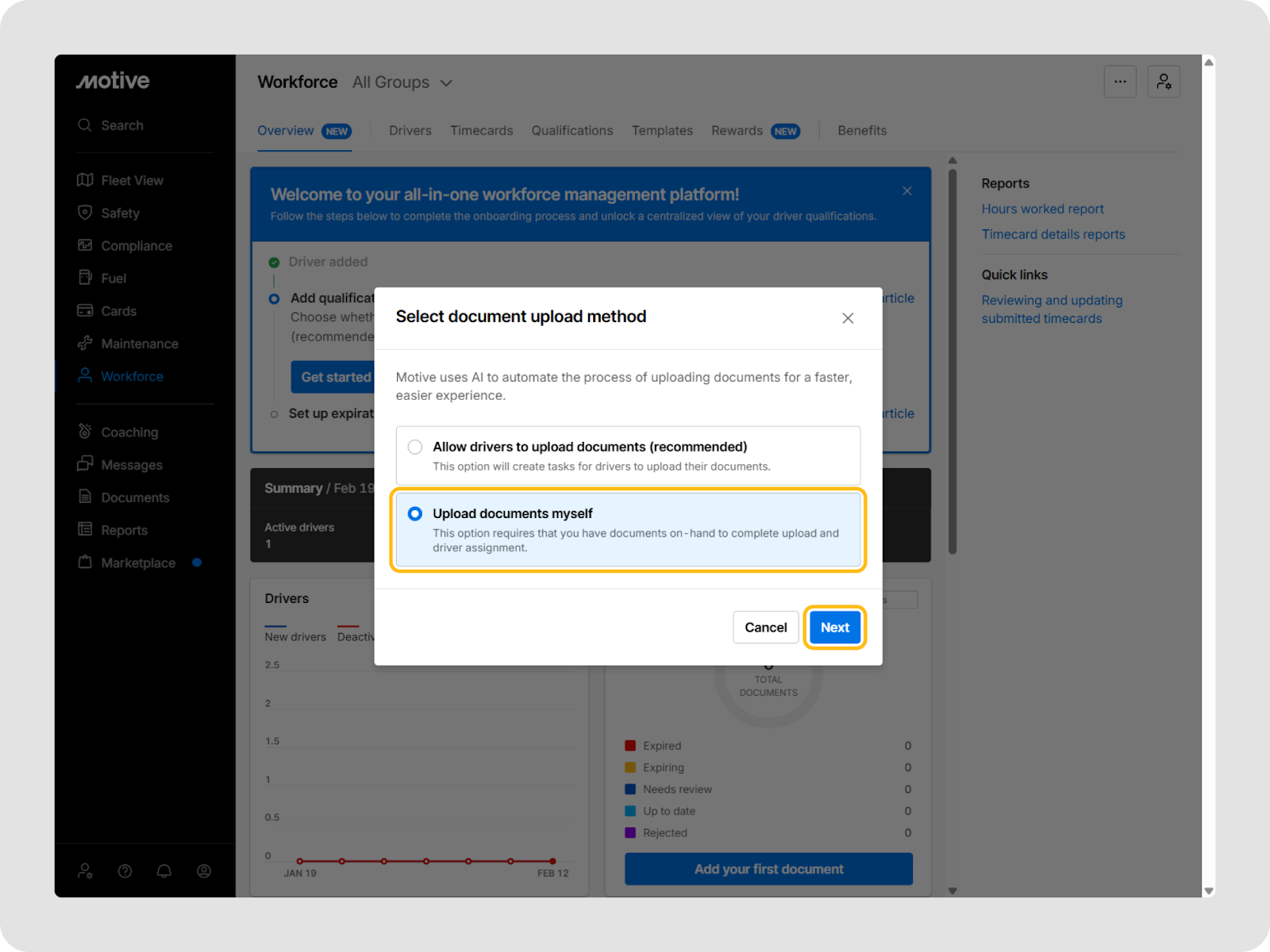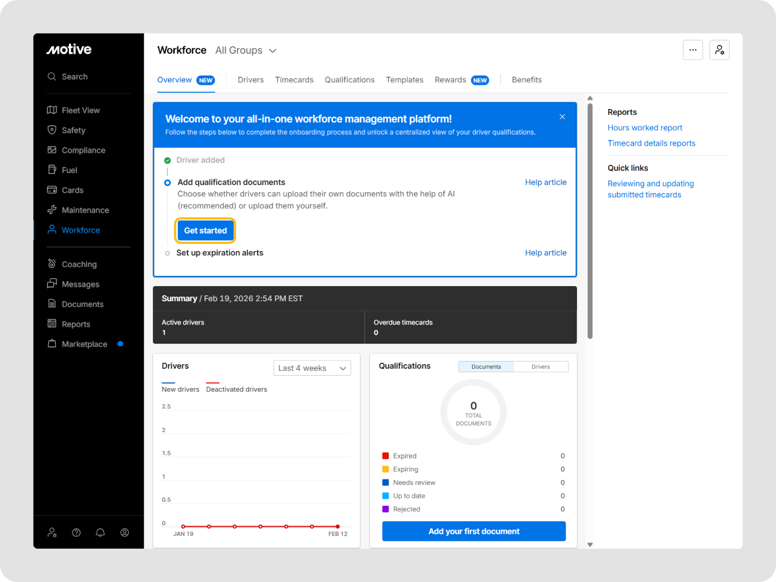 - Onboarding wizard: The updated Workforce Overview tab displays an onboarding wizard that guides you through creating drivers, uploading your first qualification document (starting with Driver license in this update), and configuring expiration alerts so you can drive value from the available features.