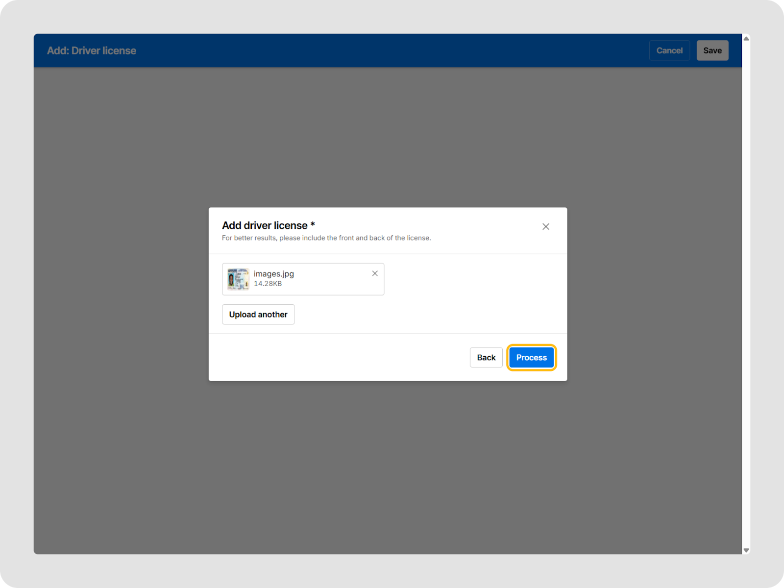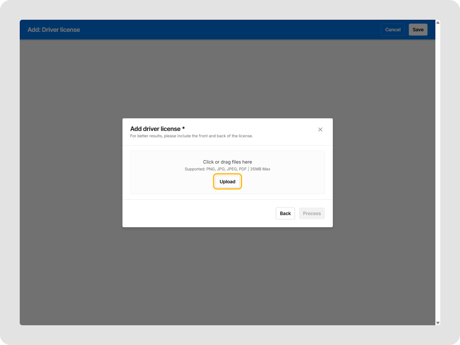 - Click Upload or drag and drop to upload the driver license file.