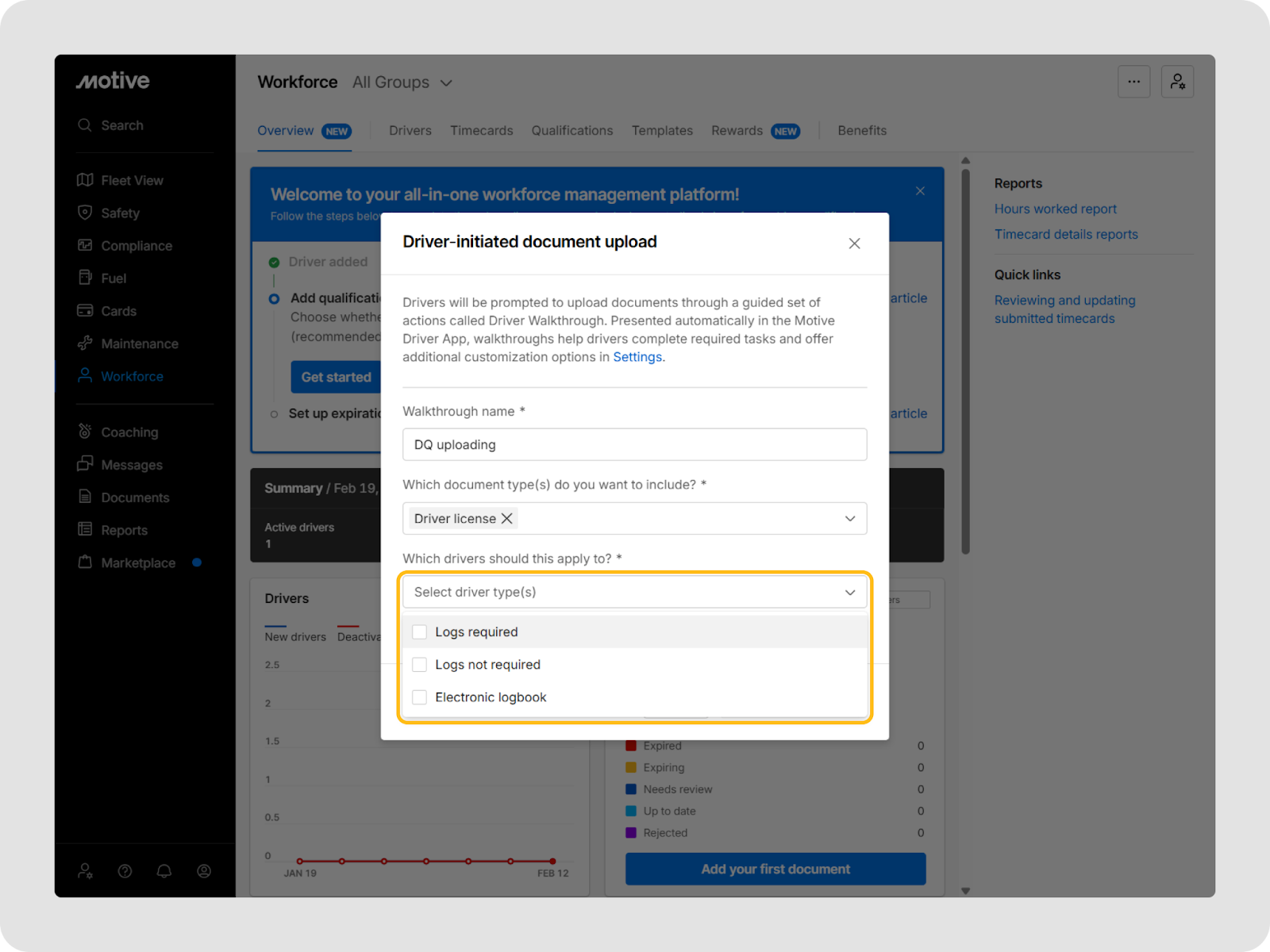 The new experience adds a welcome video and guided onboarding that prompt WFM customers who haven’t actively used key qualification features to add drivers, upload qualification documents, and configure alerts so they can get the most value from their subscription
