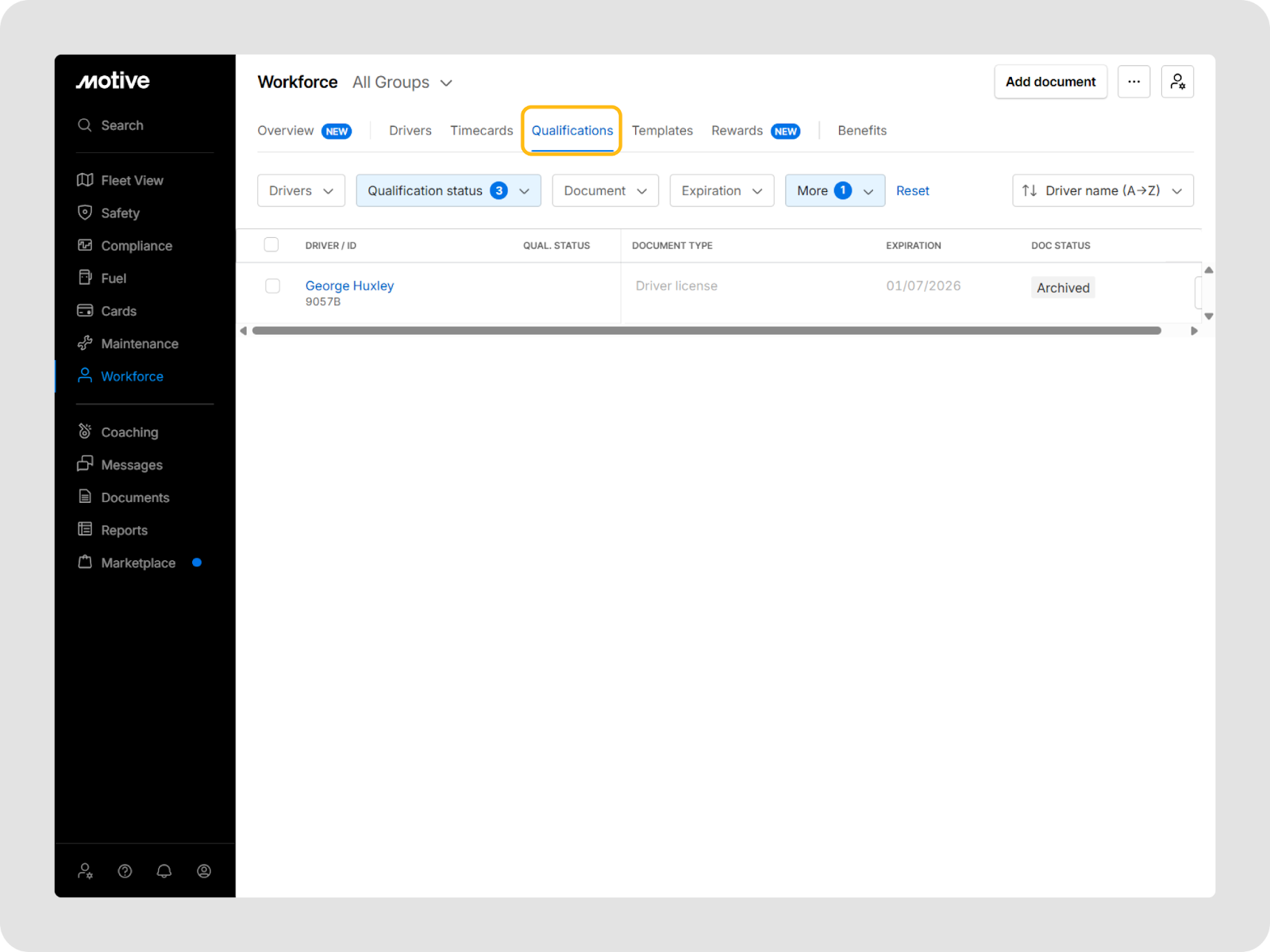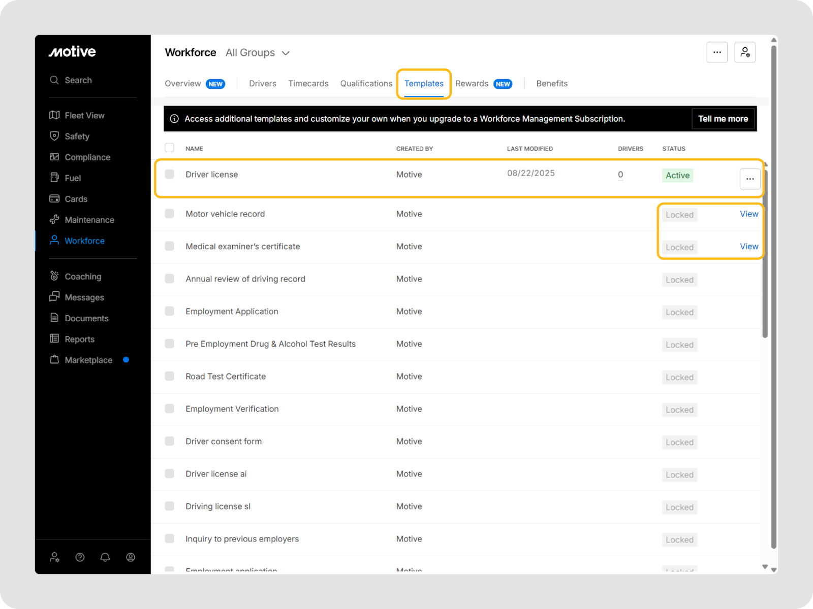 Your existing Driver License documents stay in Motive when you upgrade to the paid WFM subscription. Upgrading simply unlocks additional qualification templates, alerts, and Workforce Management features on top of what you have already set up.