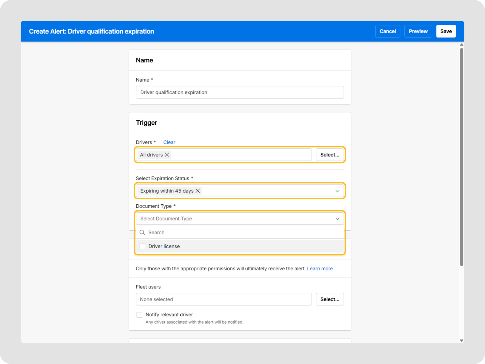 - Select Drivers and Expiration status for the alert.