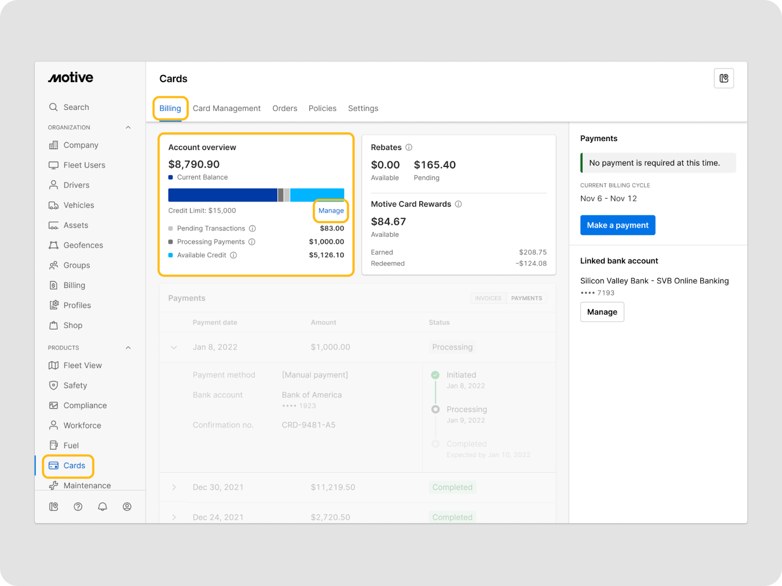 - Log in to the Motive Fleet Dashboard and go to Admin > Cards > Billing > Account overview > Manage.