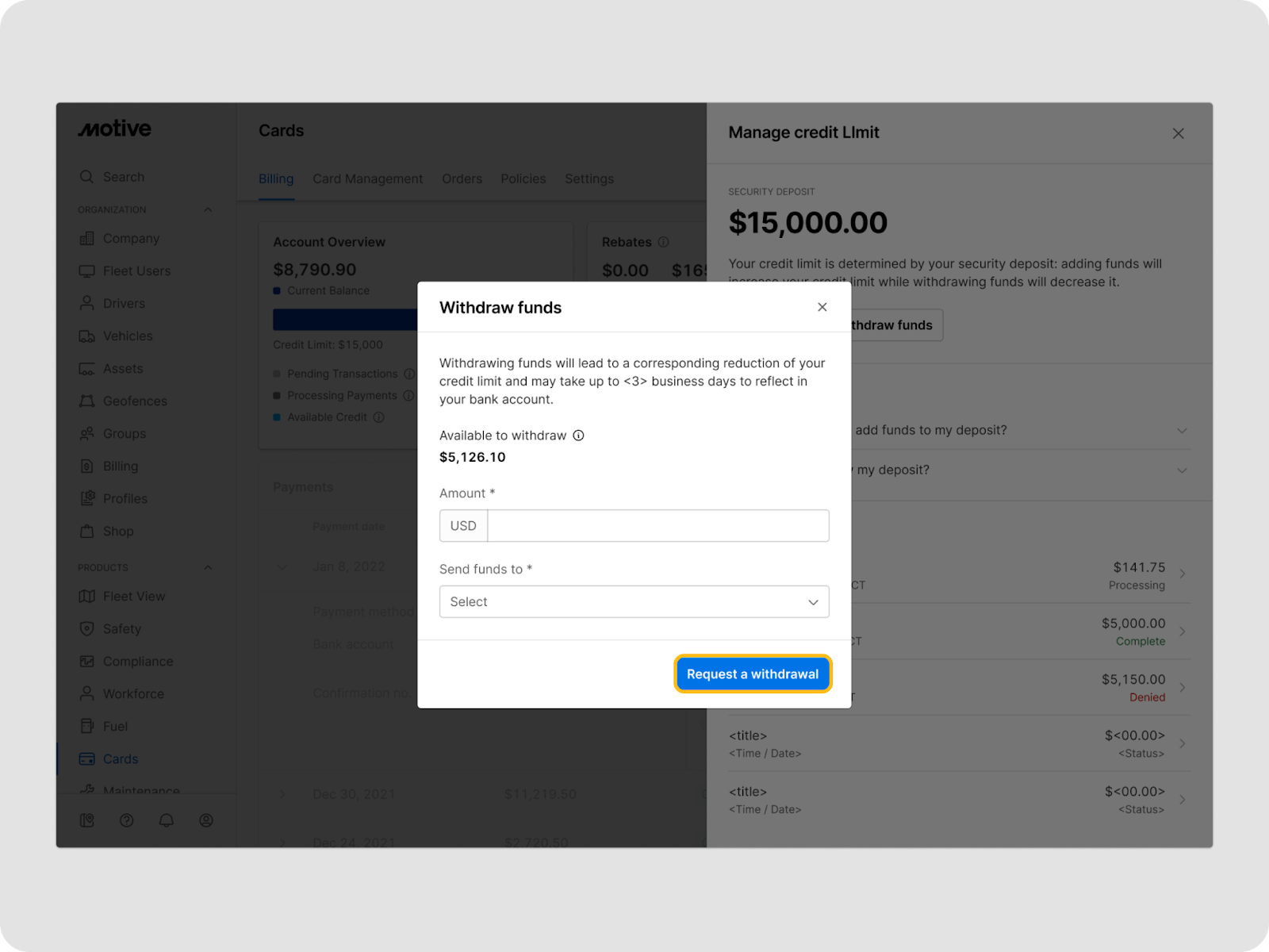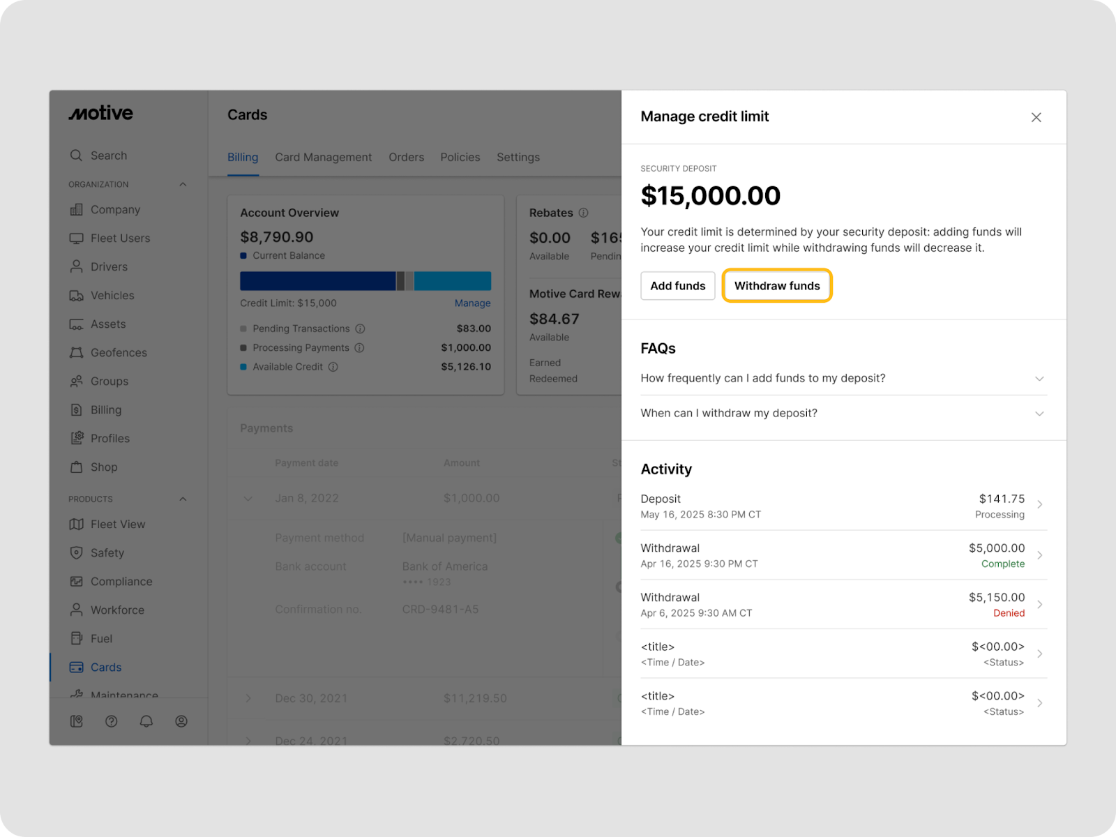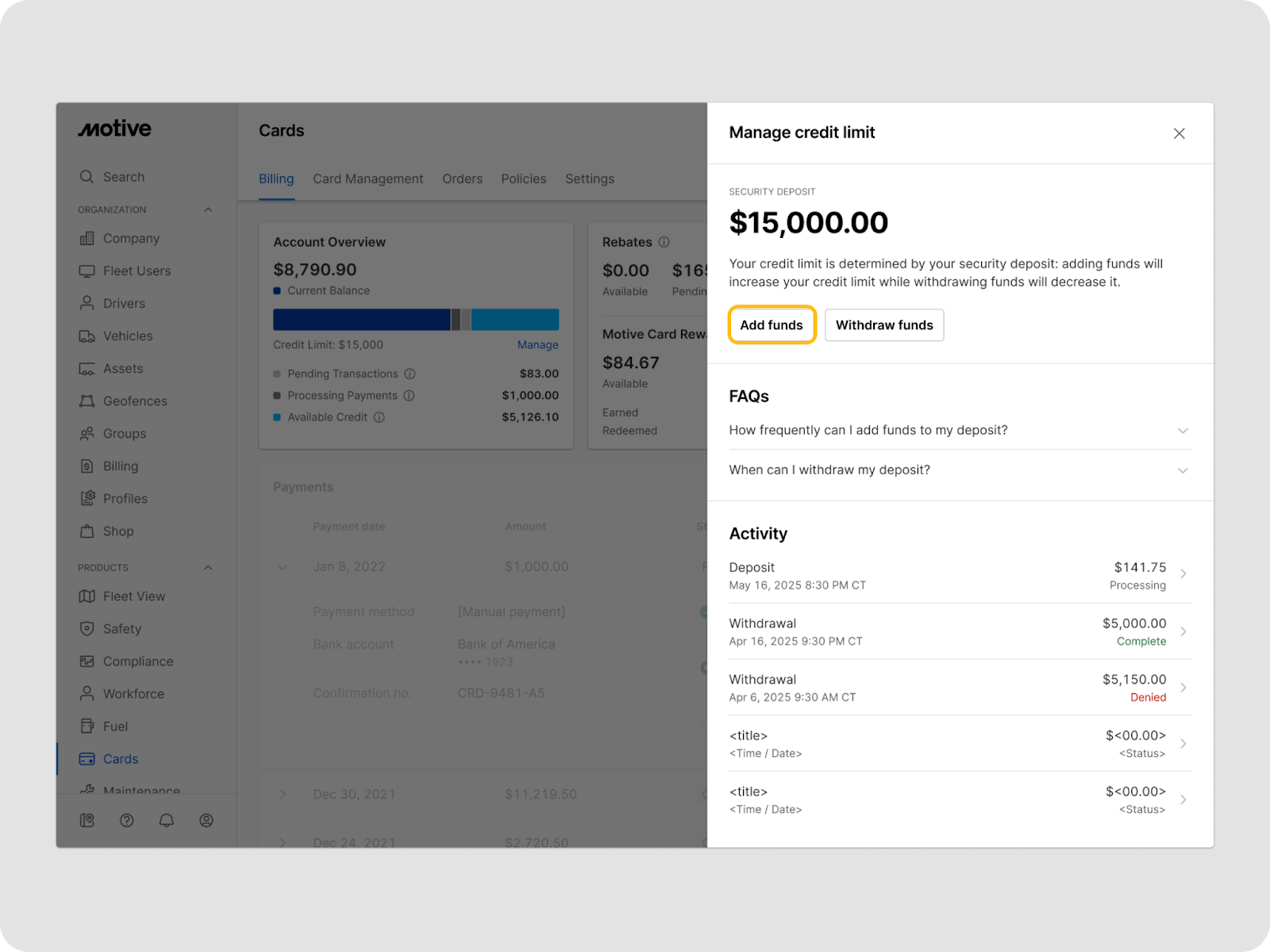 - Access Motive Benefits: Use Motive Card for fuel and non‑fuel spend, access Motive’s discounts and platform, and get a working credit line backed by a refundable security deposit.