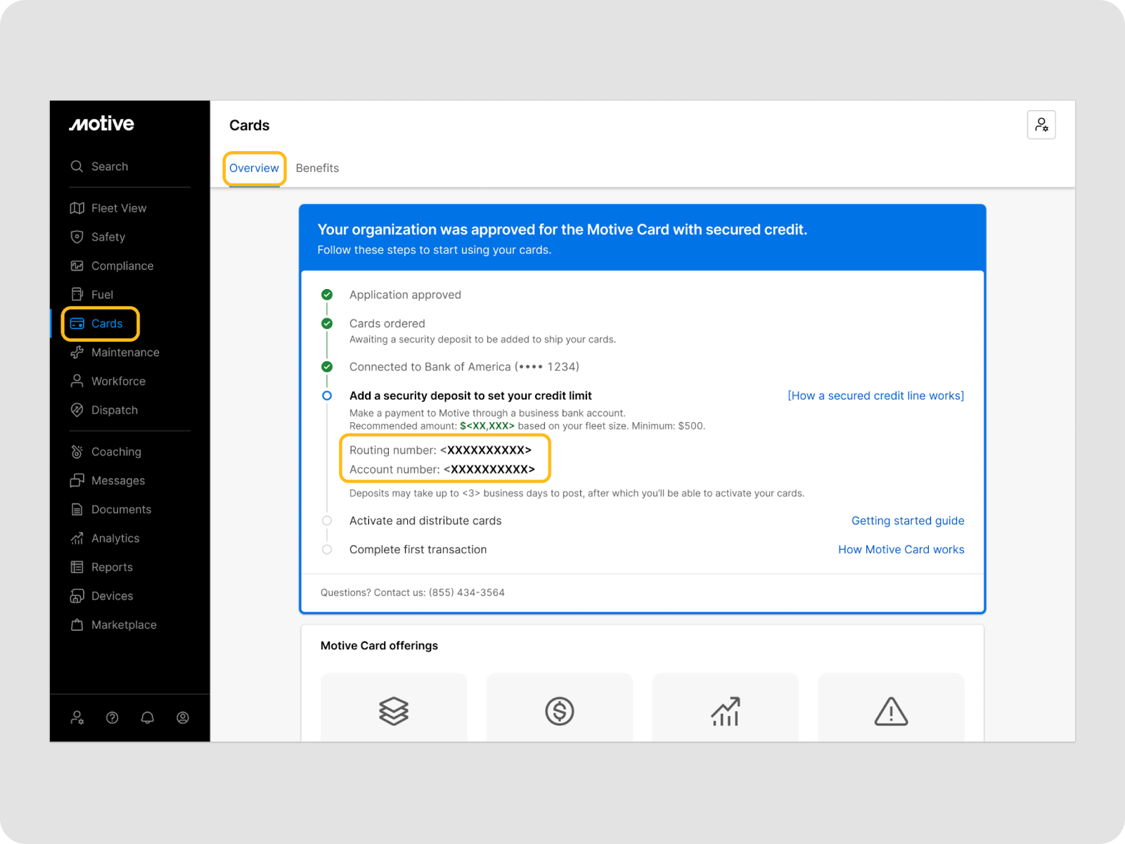 - Once your credit has been approved, log in to the Motive Fleet Dashboard and go to Cards > Overview
