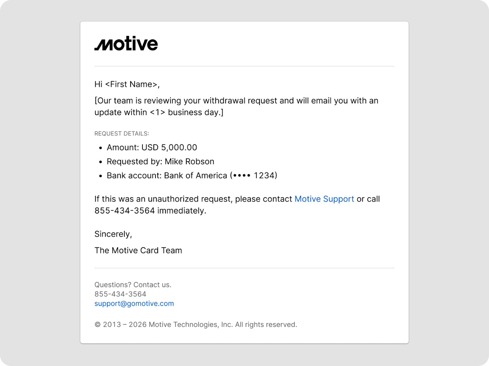 - Motive’s team will review the withdrawal request, and once verified you will receive a confirmation email.