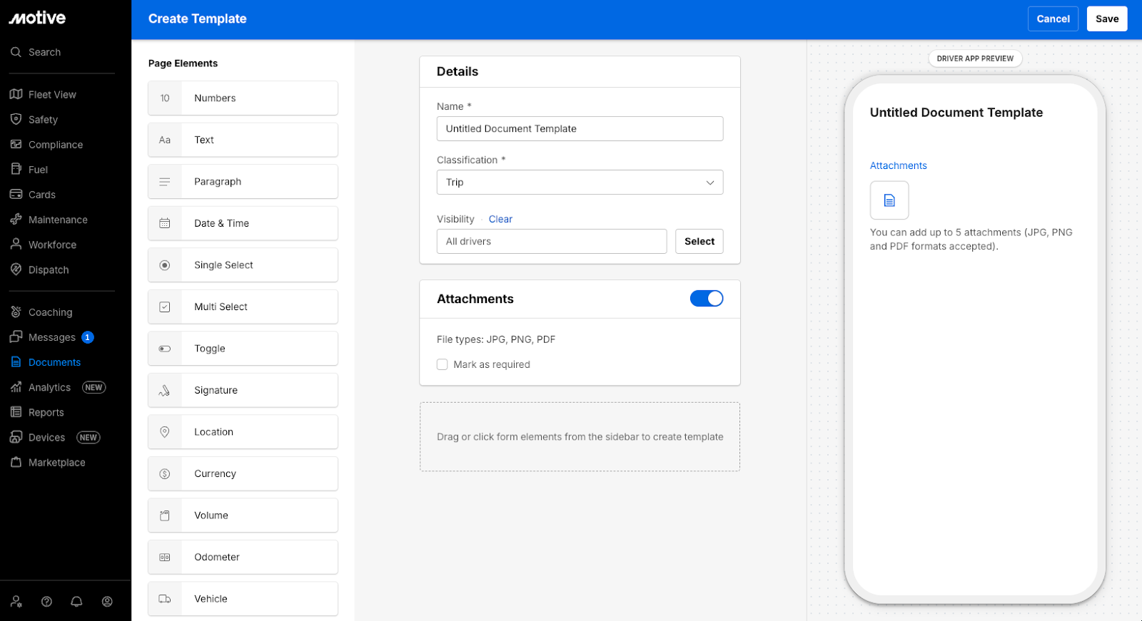 Custom document templates allow your drivers to submit specific information—like trip logs, fuel receipts, or inspection reports—directly through the Motive Driver App.