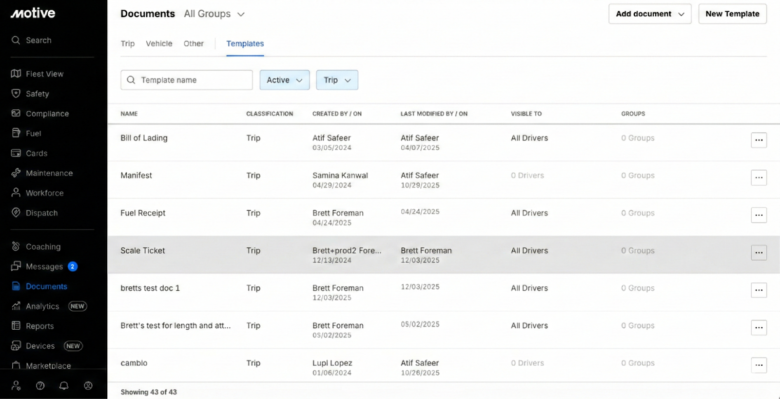 - Standard templates: Motive provides standard Trip and Vehicle document templates that organizations can use directly or customize for their fleet.