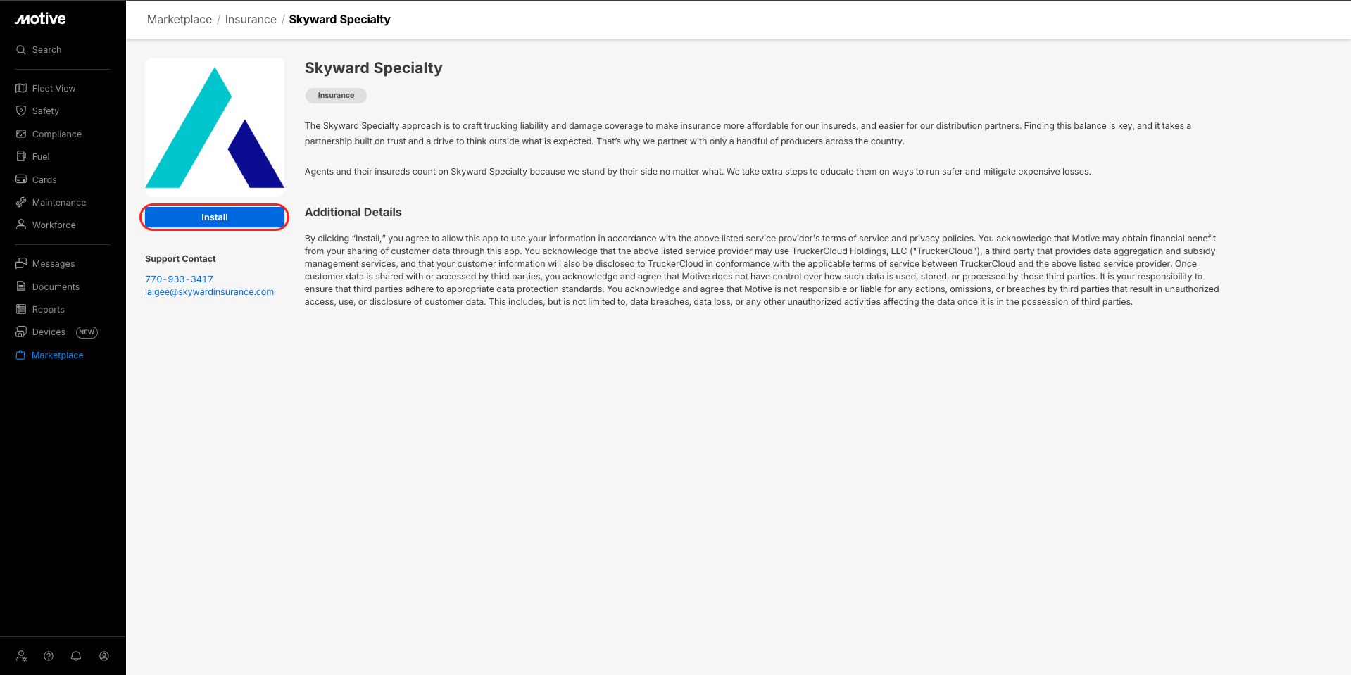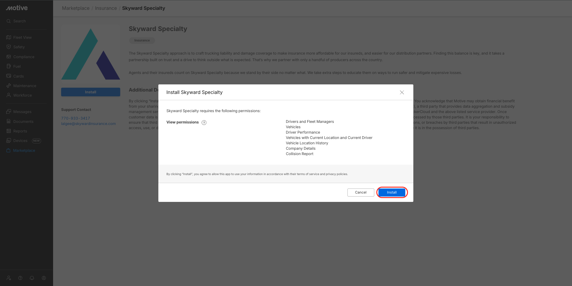 - Once you’ve clicked Install, a pop-up banner appears; click Install. This authenticates the integration and redirects you to the Skyward Specialty website.