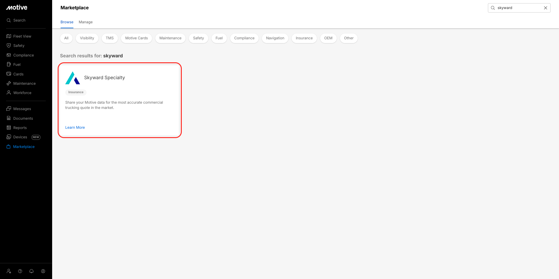 - Log in to the Motive Fleet Dashboard and click Marketplace.