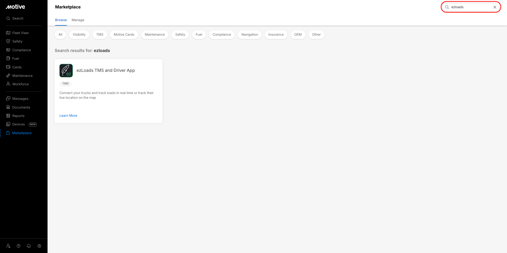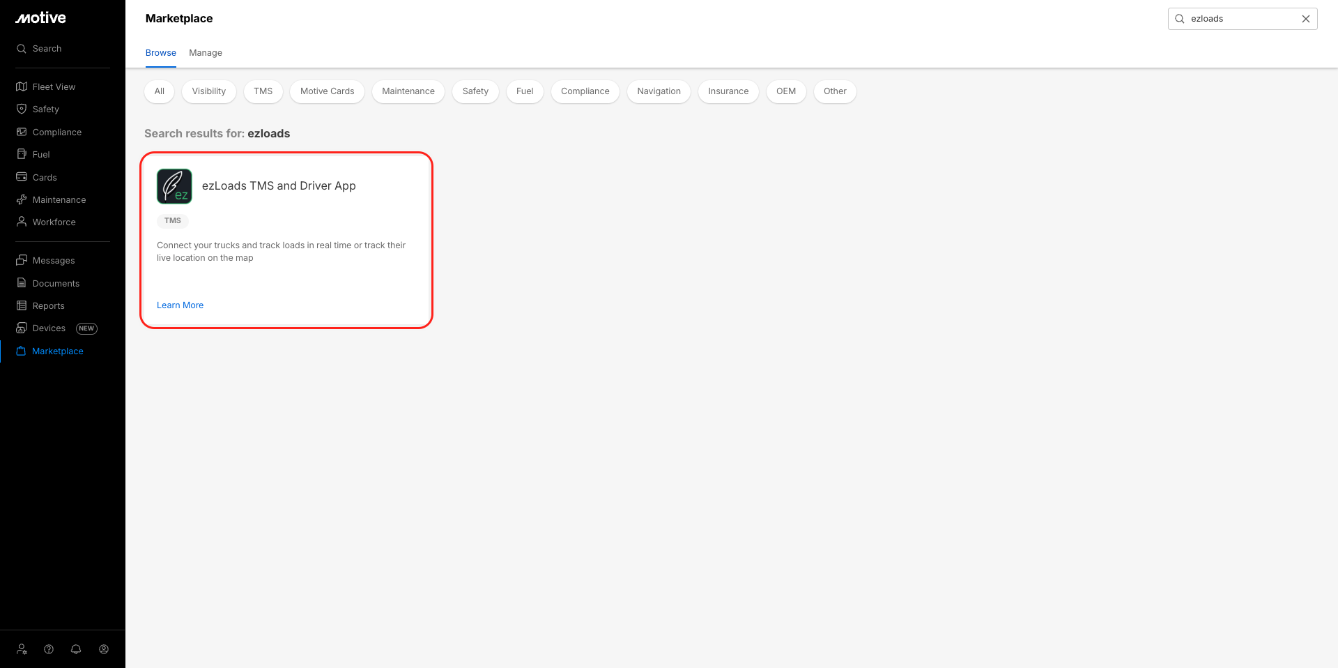 - Locate ezLoads TMS and Driver App and click Learn More.