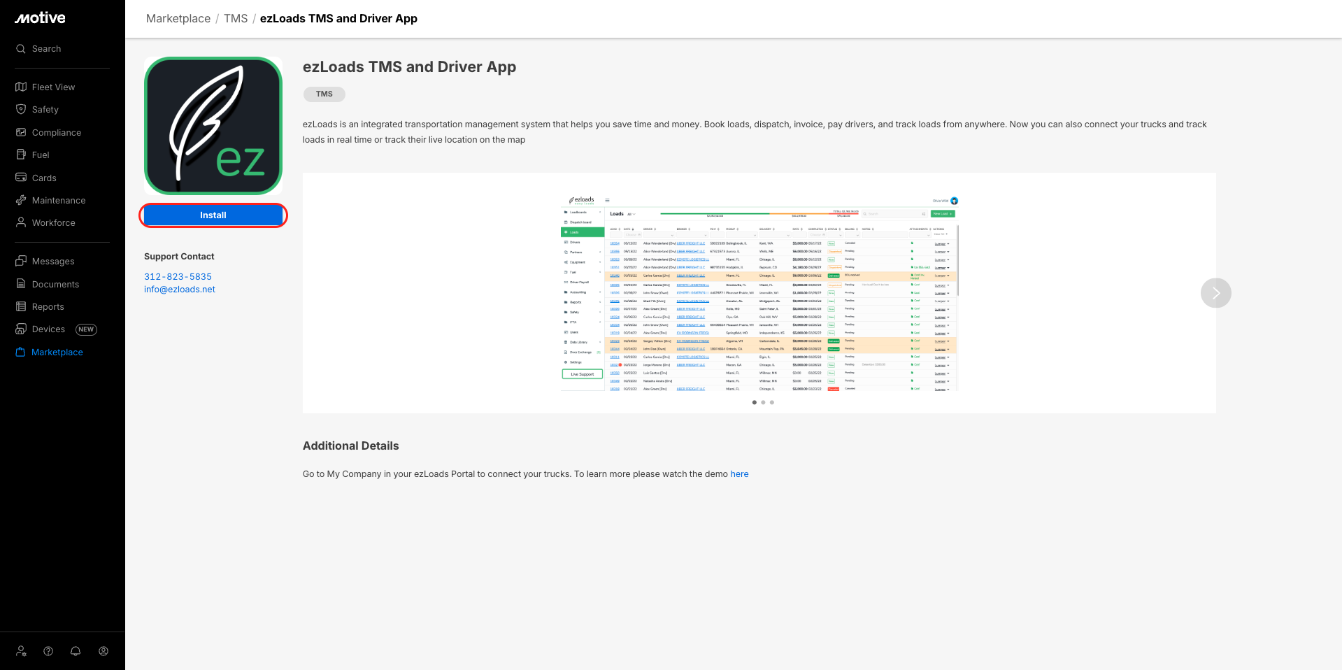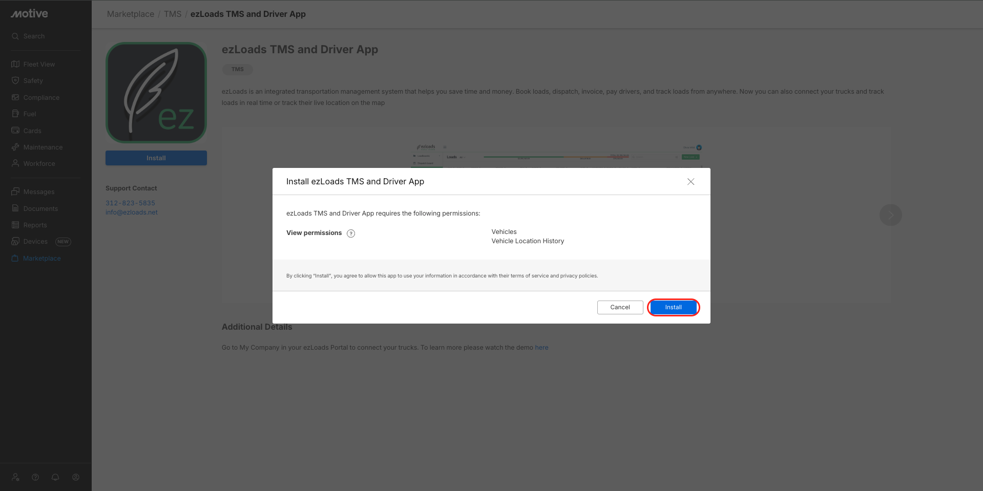 - Once you’ve clicked Install, a pop-up banner appears; click Install. This authenticates the integration and redirects you to the ezLoads TMS and Driver App website.