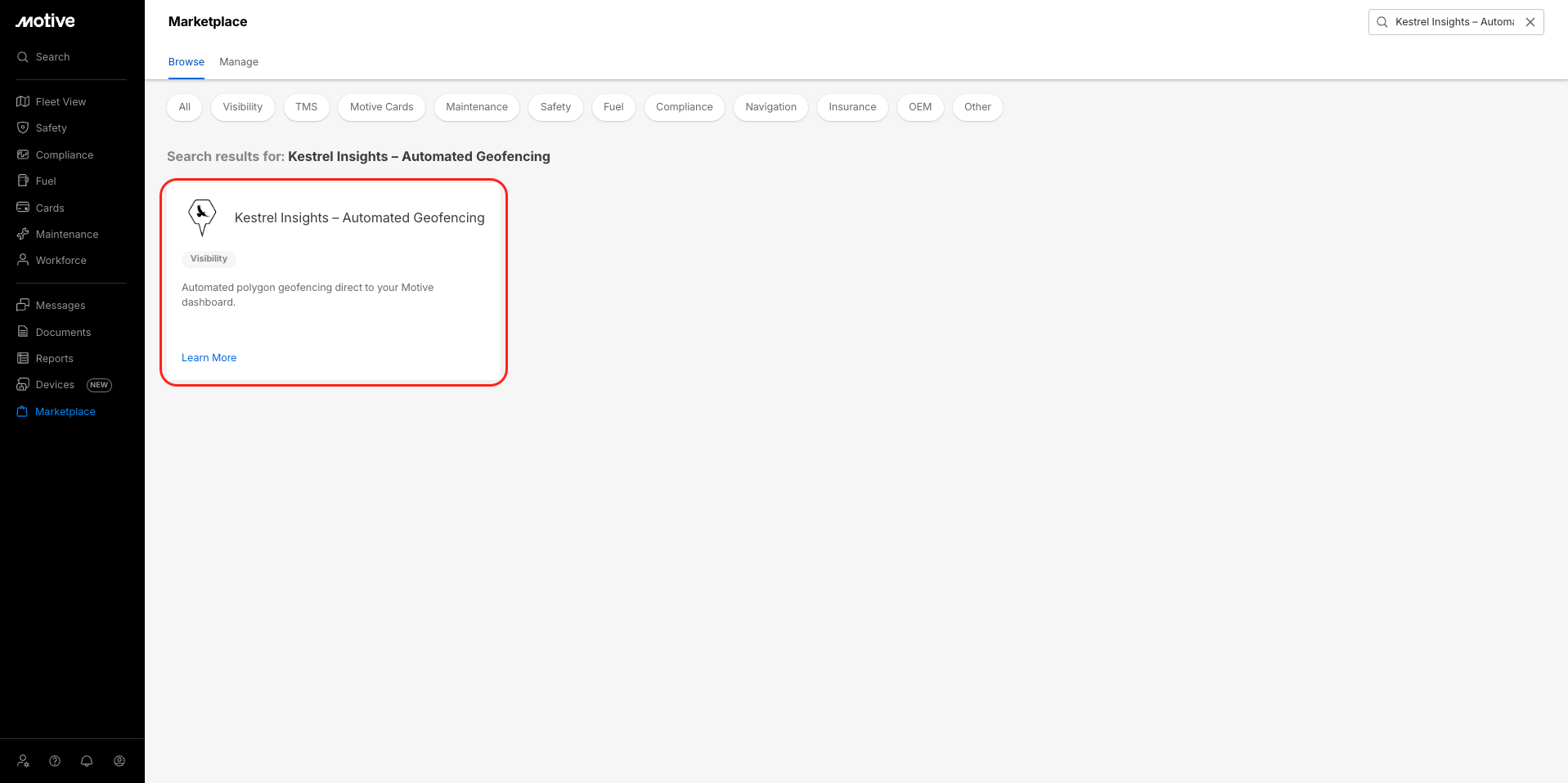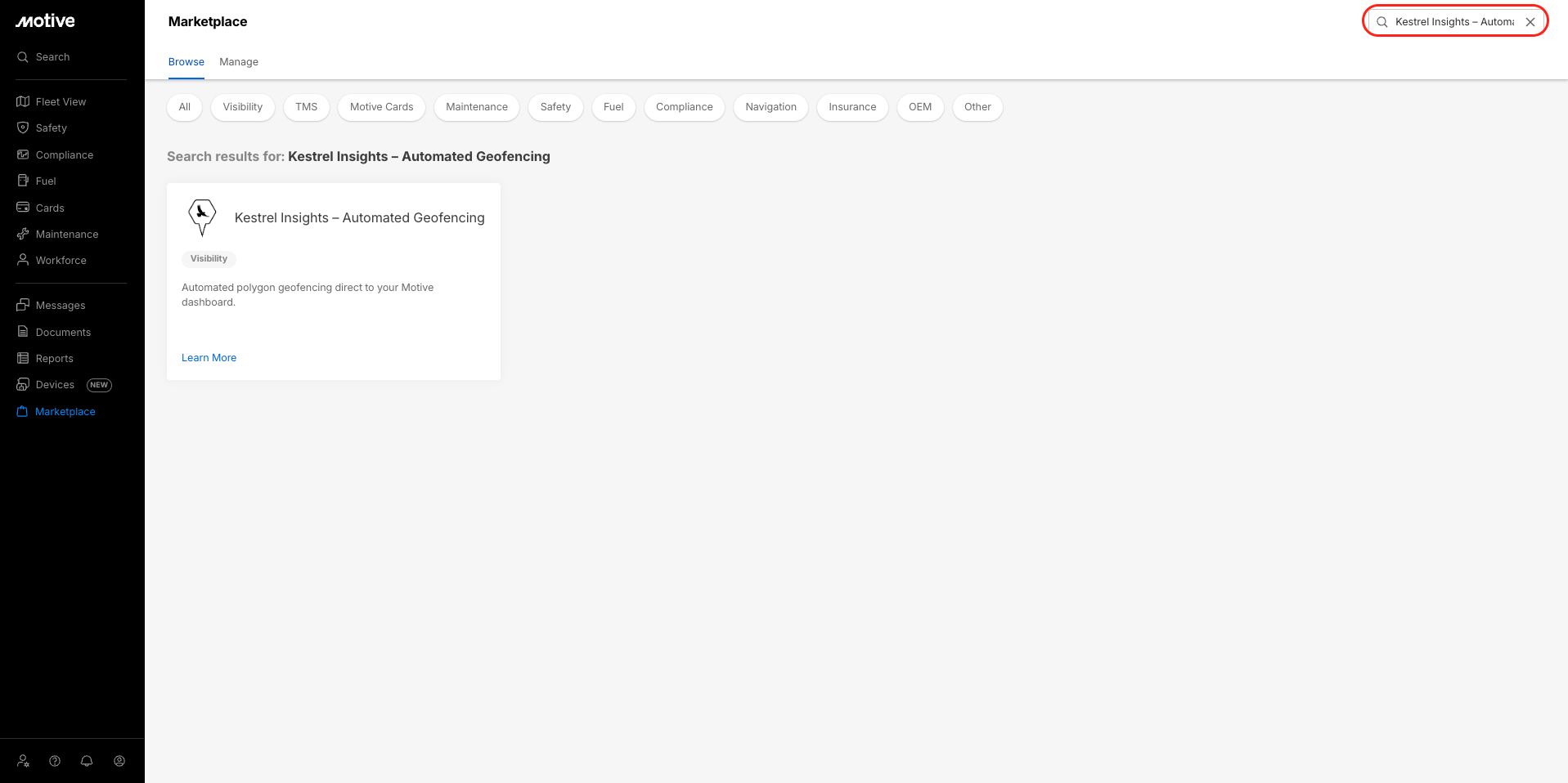 - Log in to the Motive Fleet Dashboard and click Marketplace.
