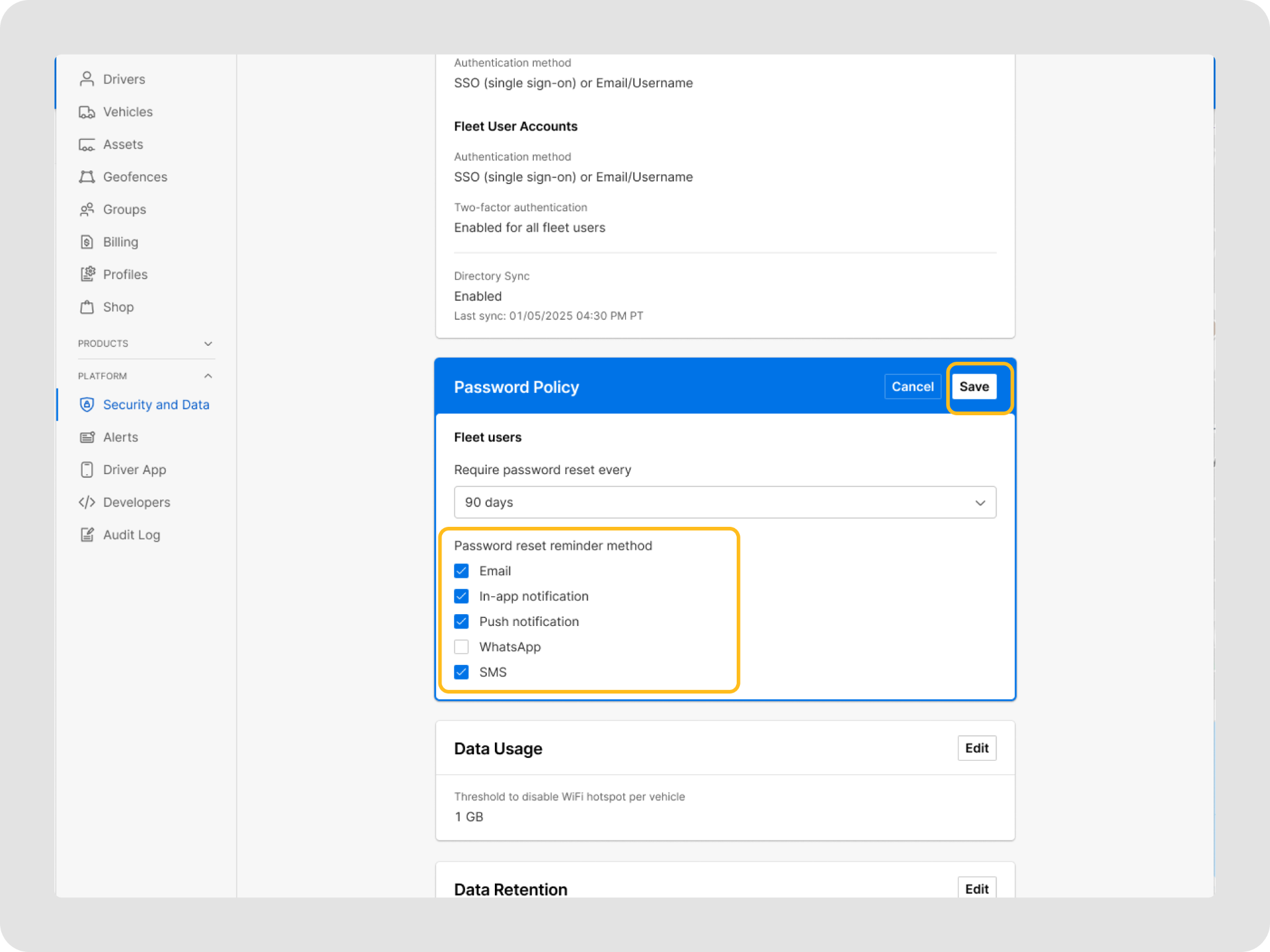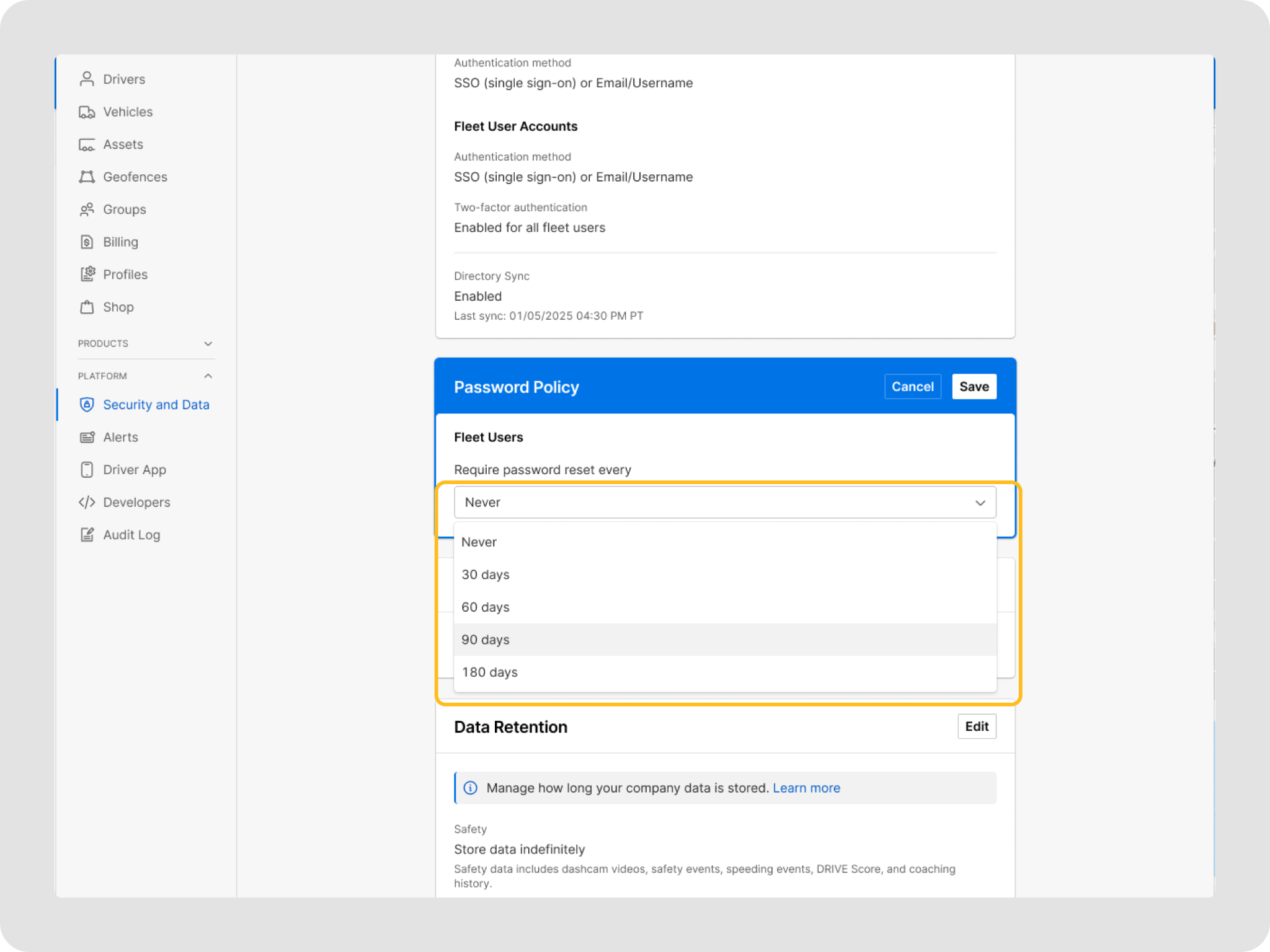 Maintaining robust security standards is critical for protecting your fleet’s sensitive data. The Password Policy feature gives Fleet Managers control over account security by requiring dashboard users to refresh their passwords at set intervals (such as every 90 or 180 days).