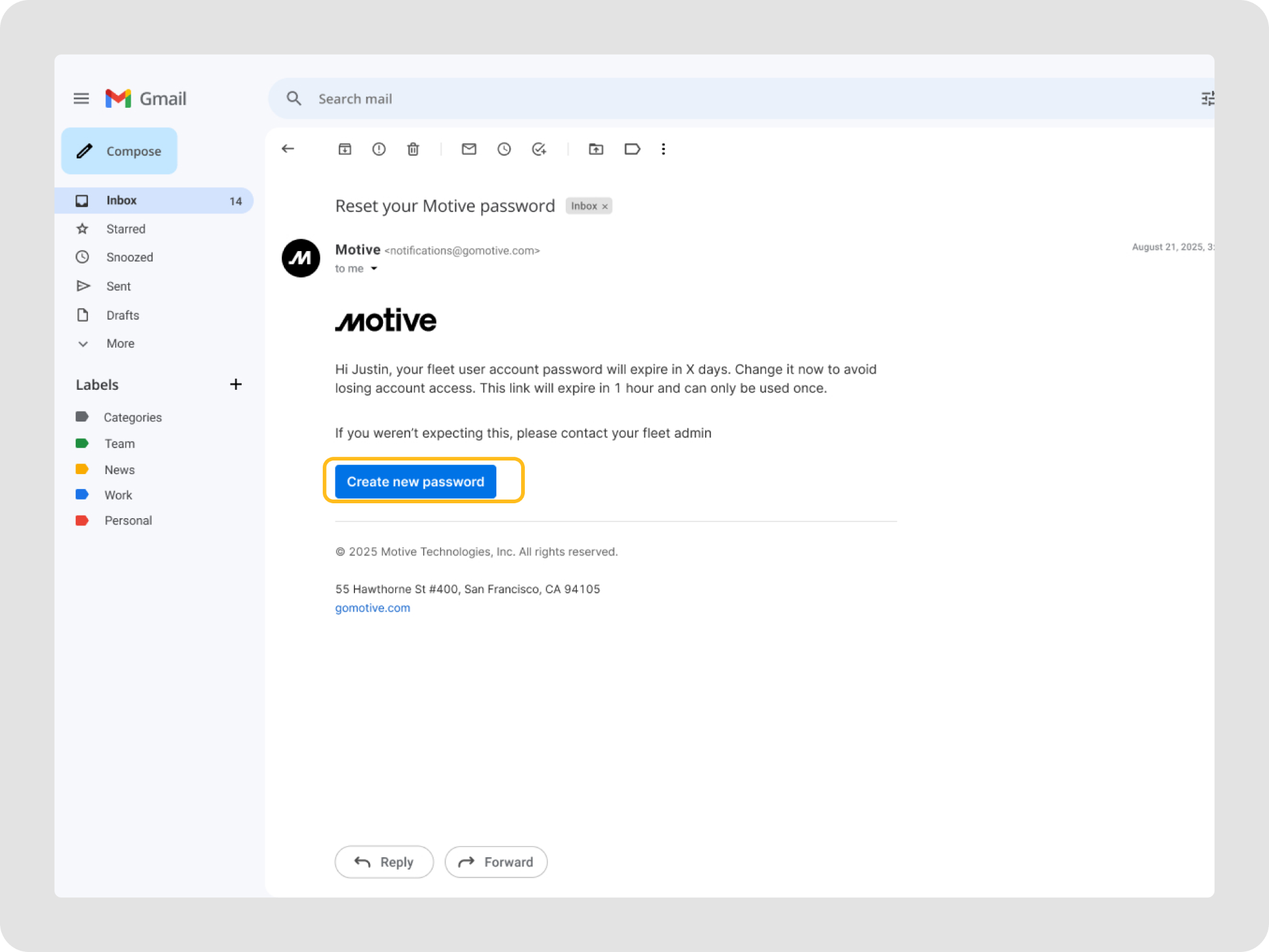 - Check your email inbox for a message from Motive with the subject line regarding your password expiration. Click the Reset Password link inside that email.