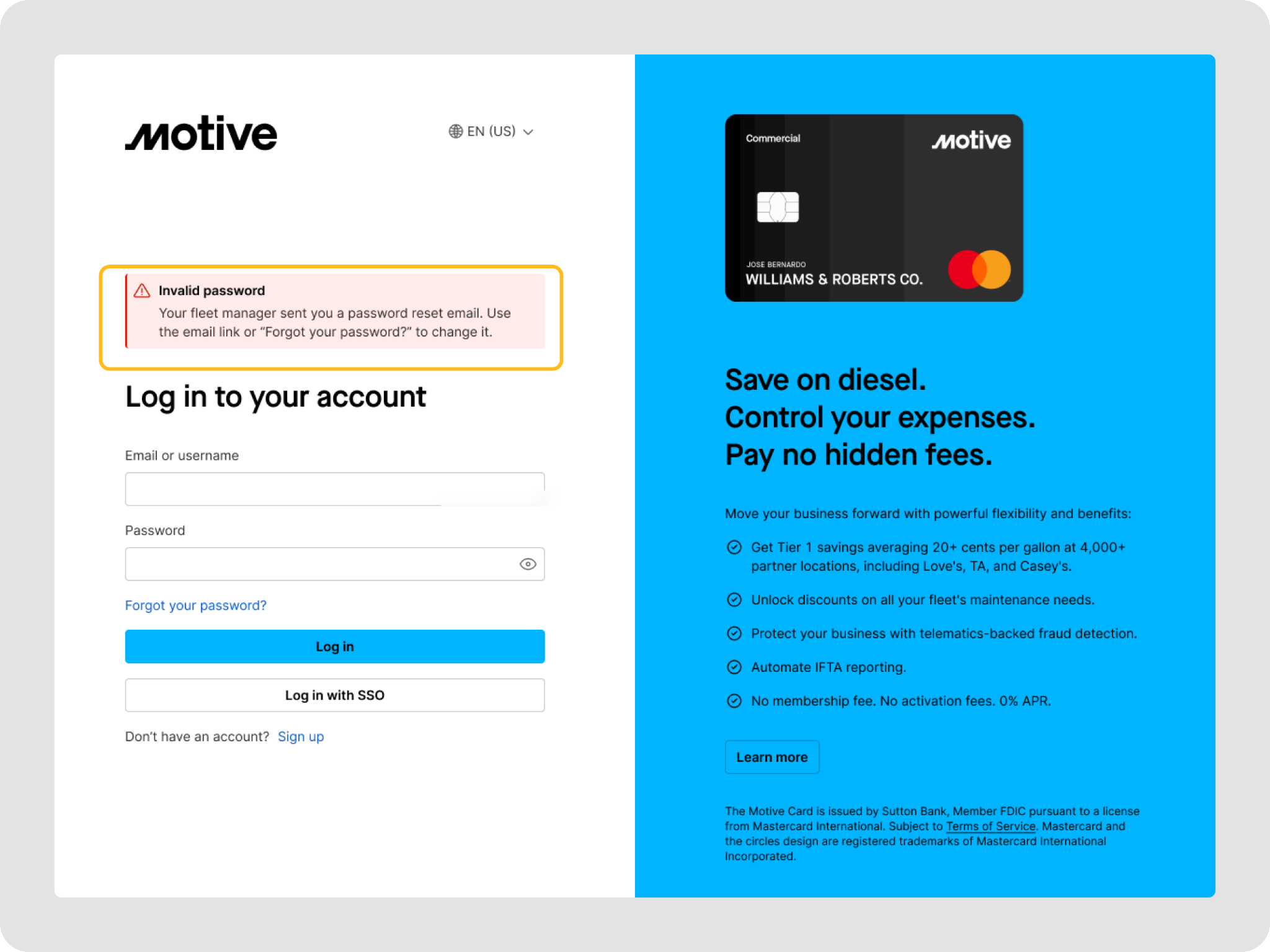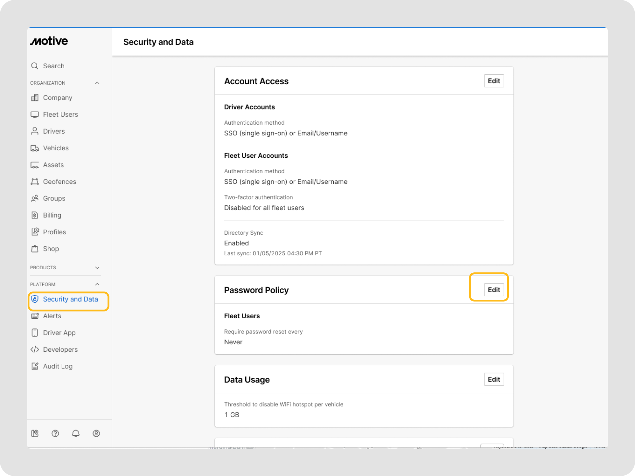 Motive’s Password Policy feature allows Fleet Managers to enforce regular password updates for all fleet user accounts. By setting custom expiration periods, fleets can automate security rotations, receive proactive reminders via email, SMS, and push notifications, and minimize unauthorized access through mandatory password resets.