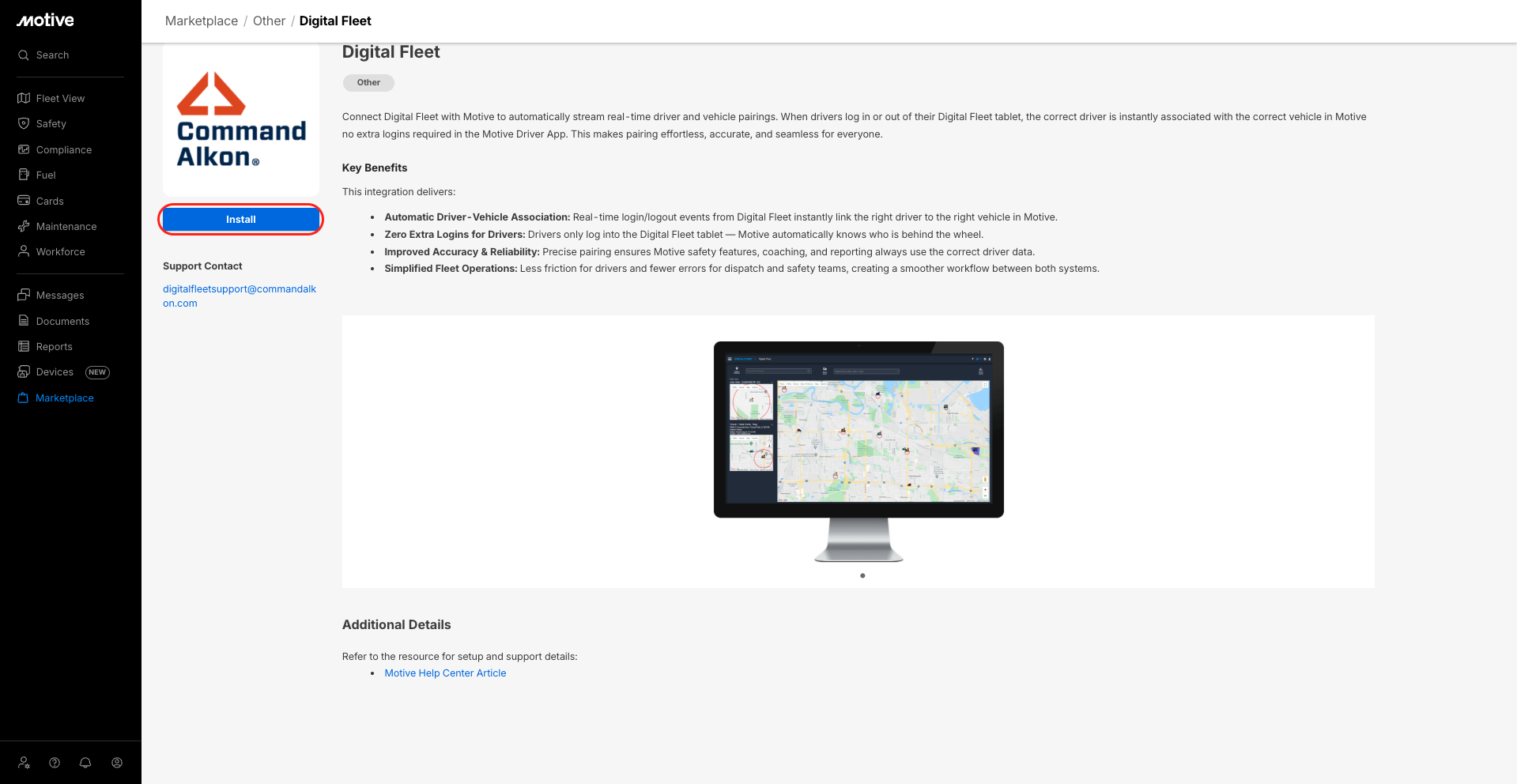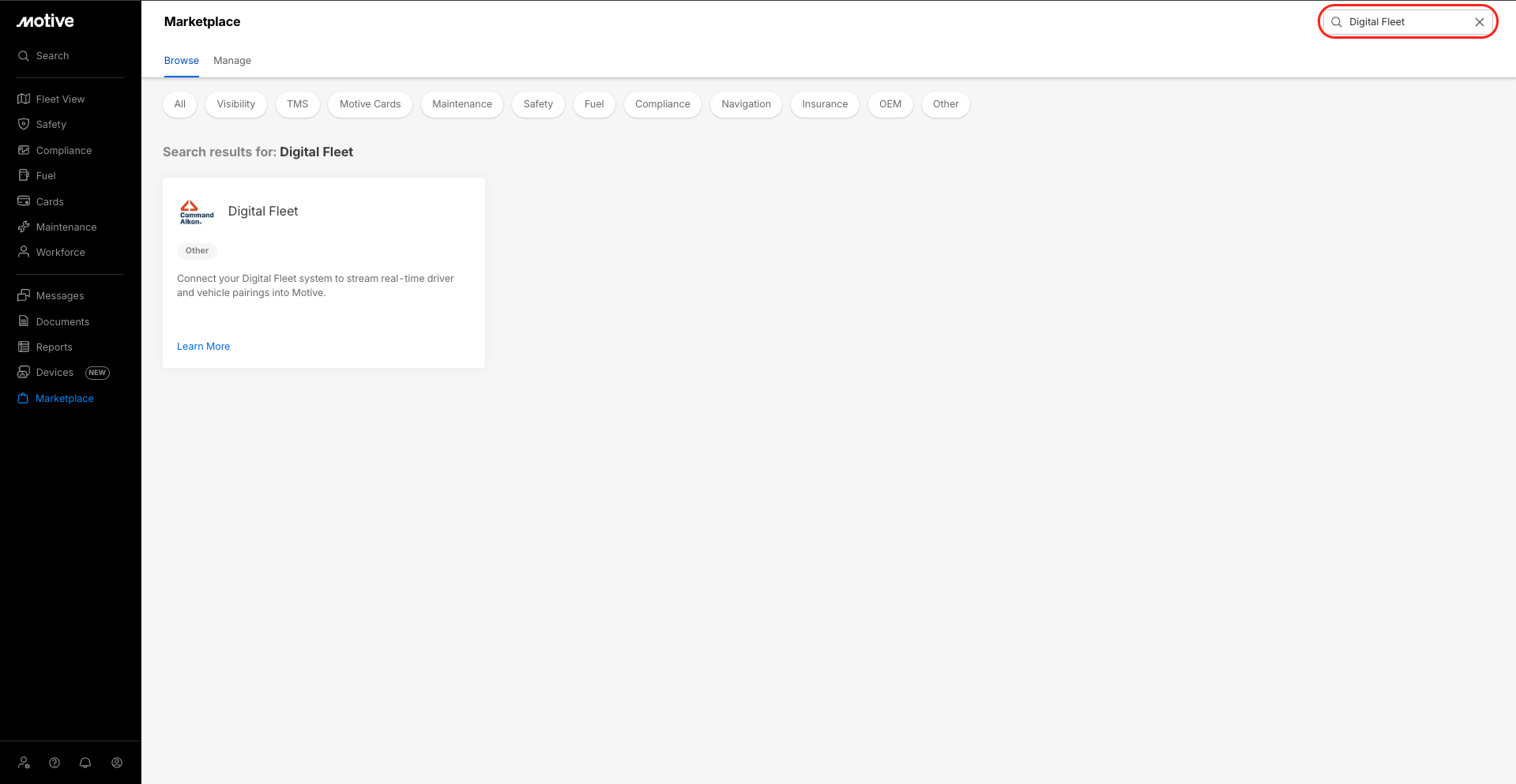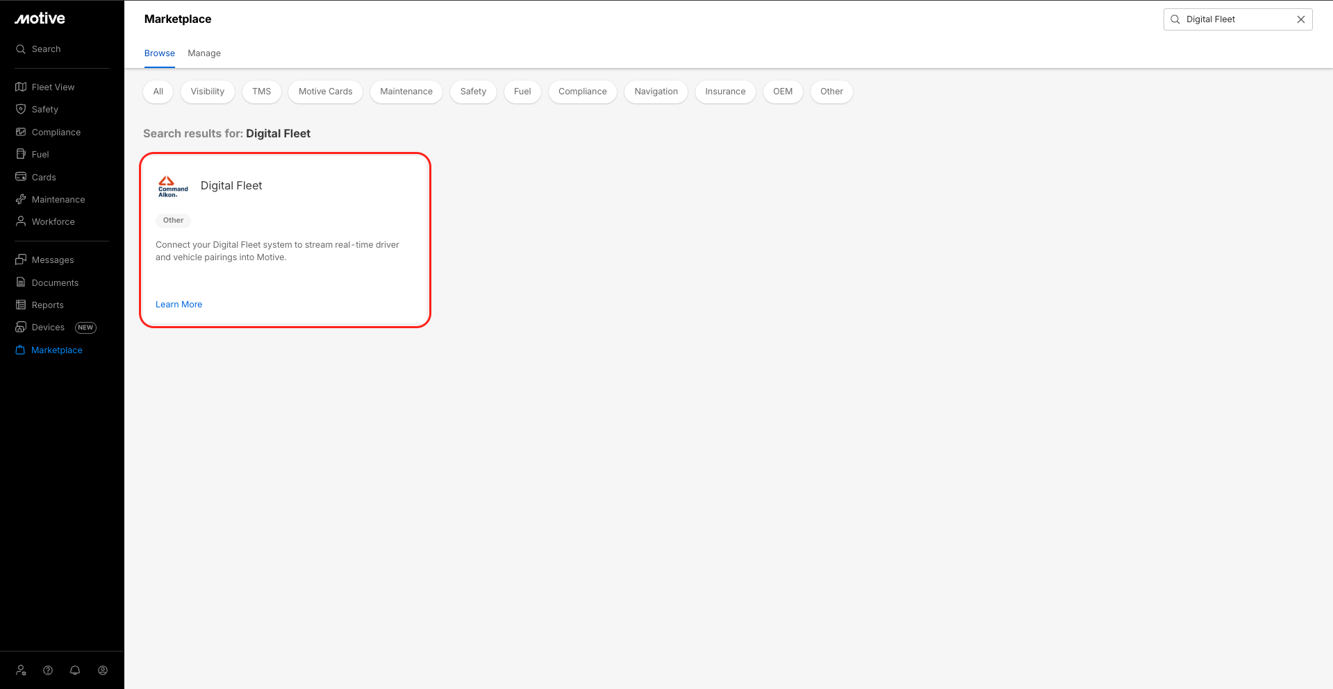 - Log in to the Motive Fleet Dashboard and click Marketplace.