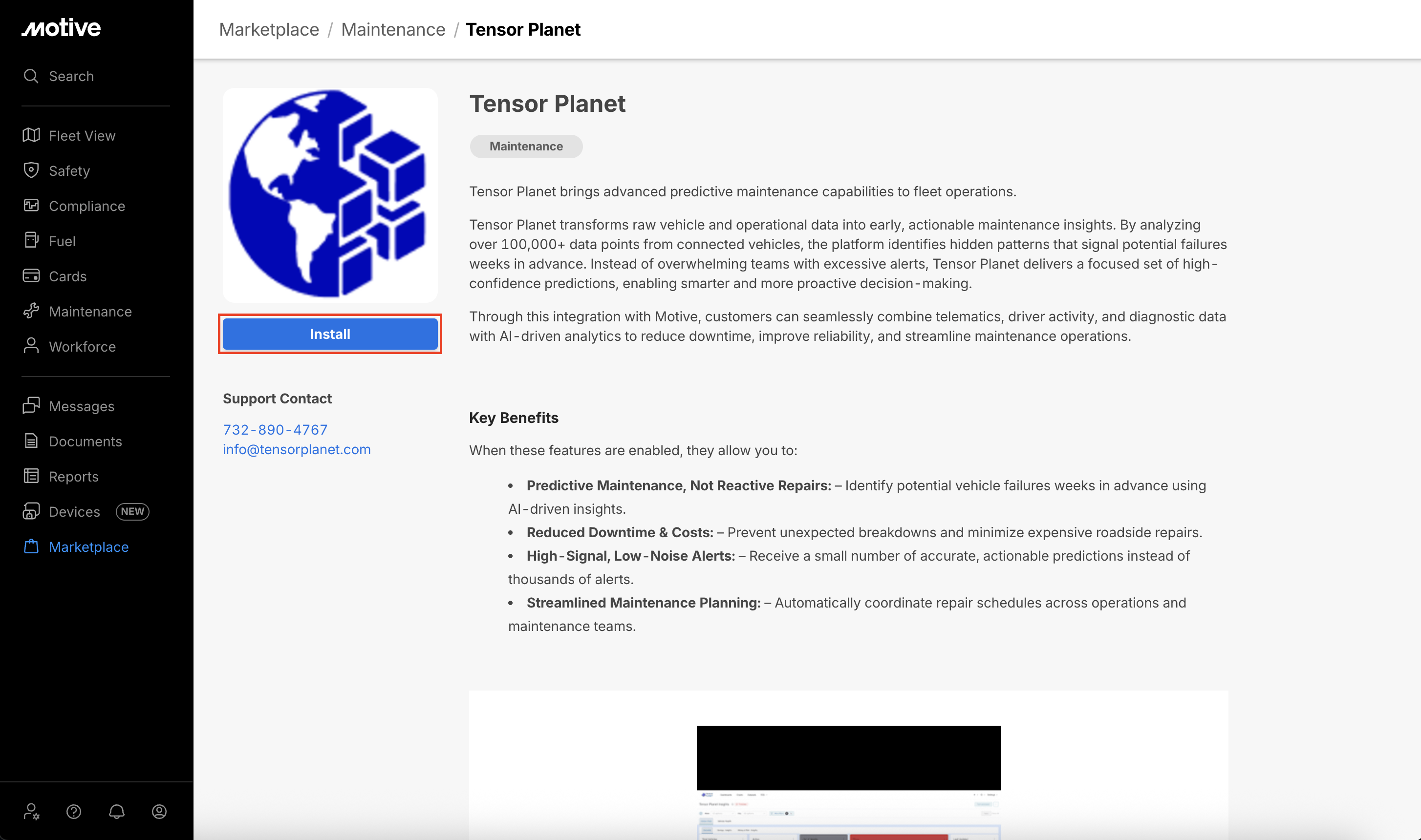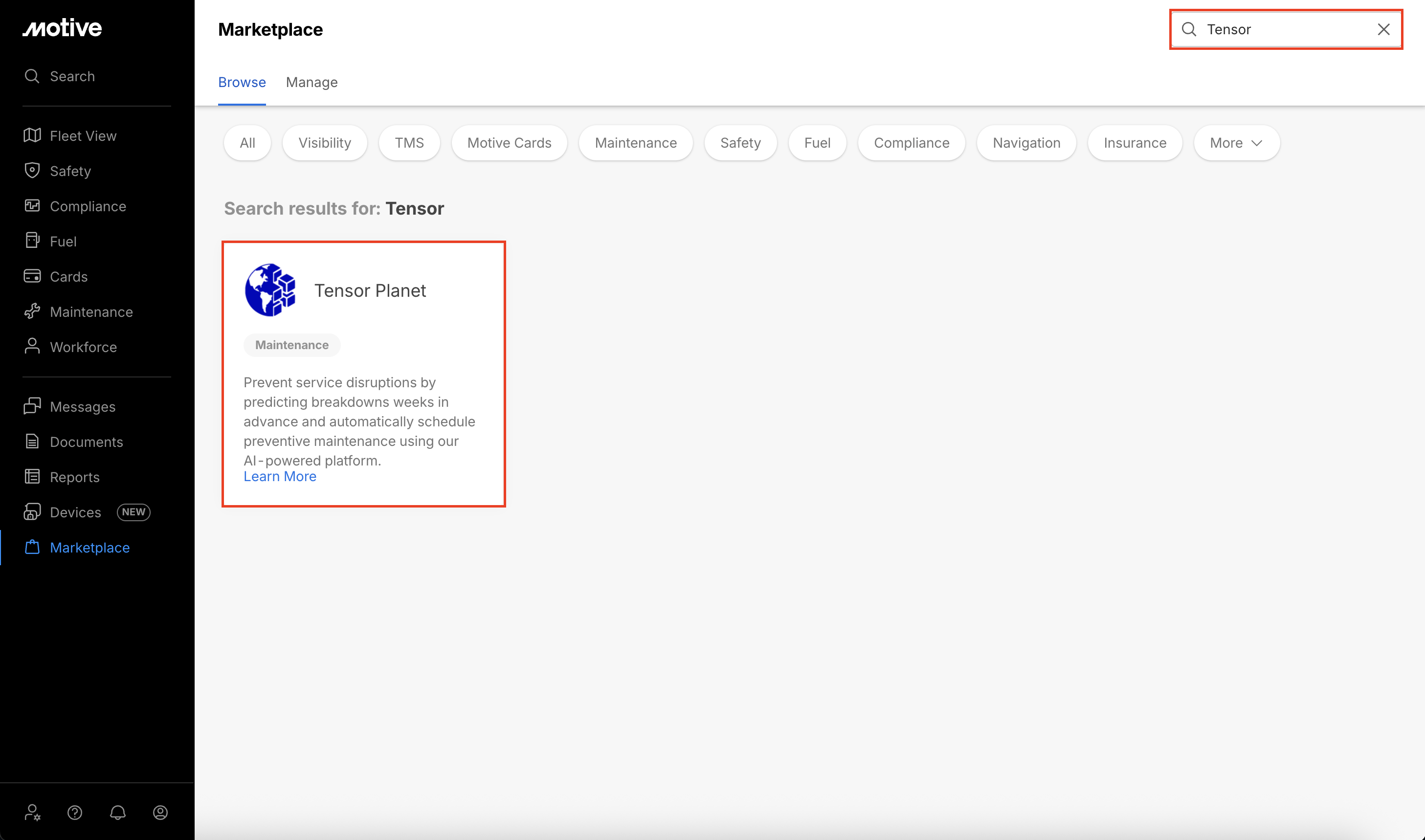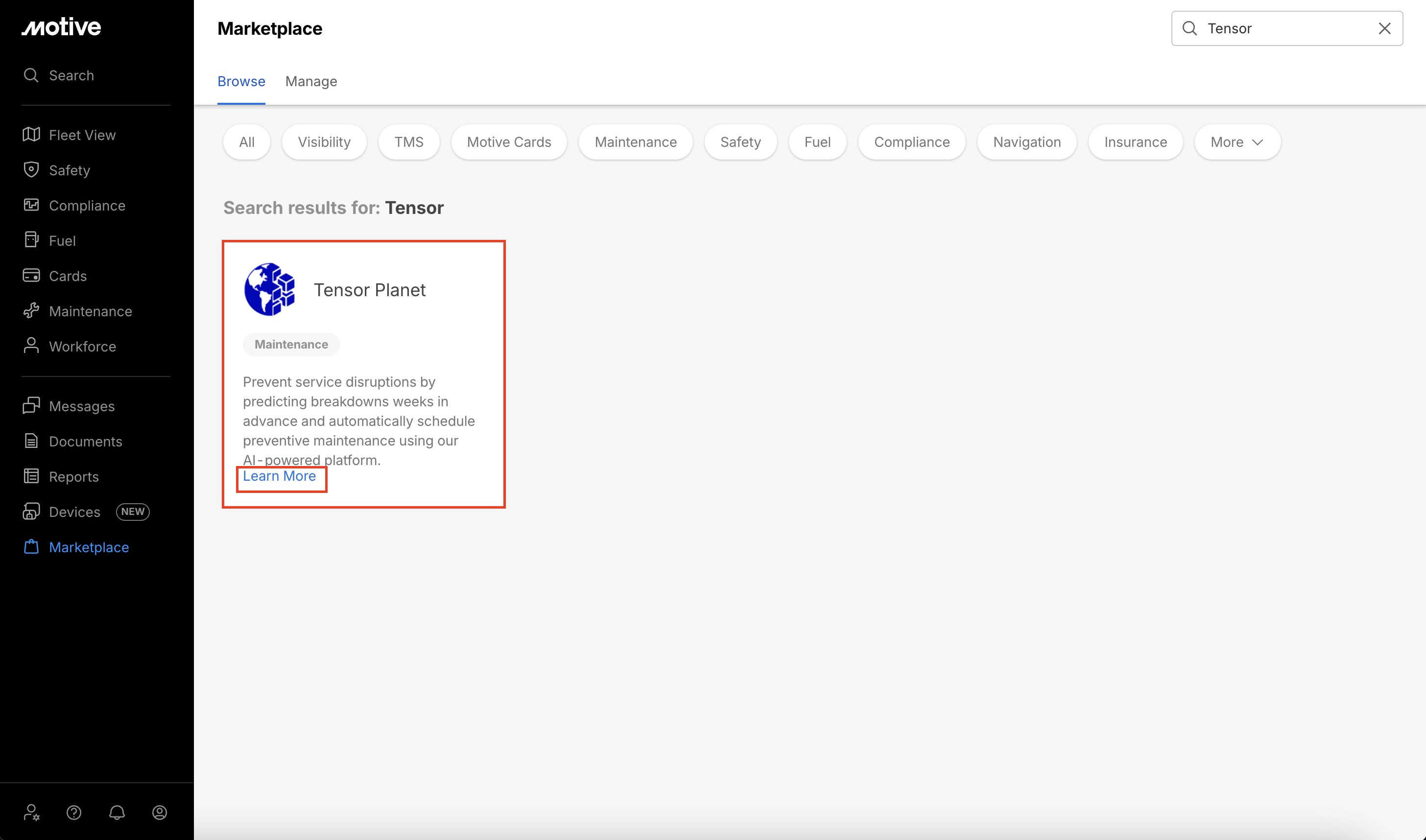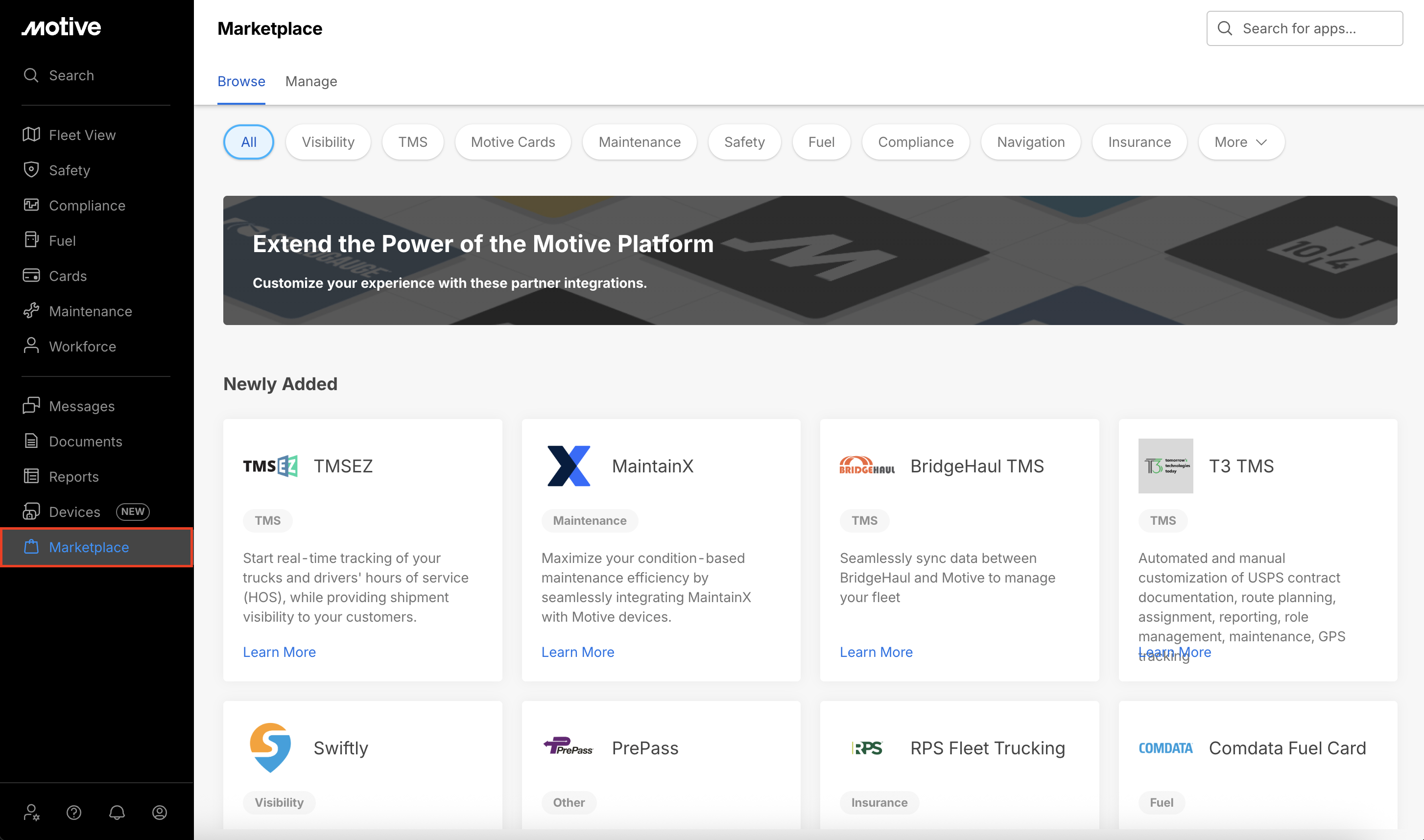 Log in to the Motive Fleet Dashboard and click Marketplace.