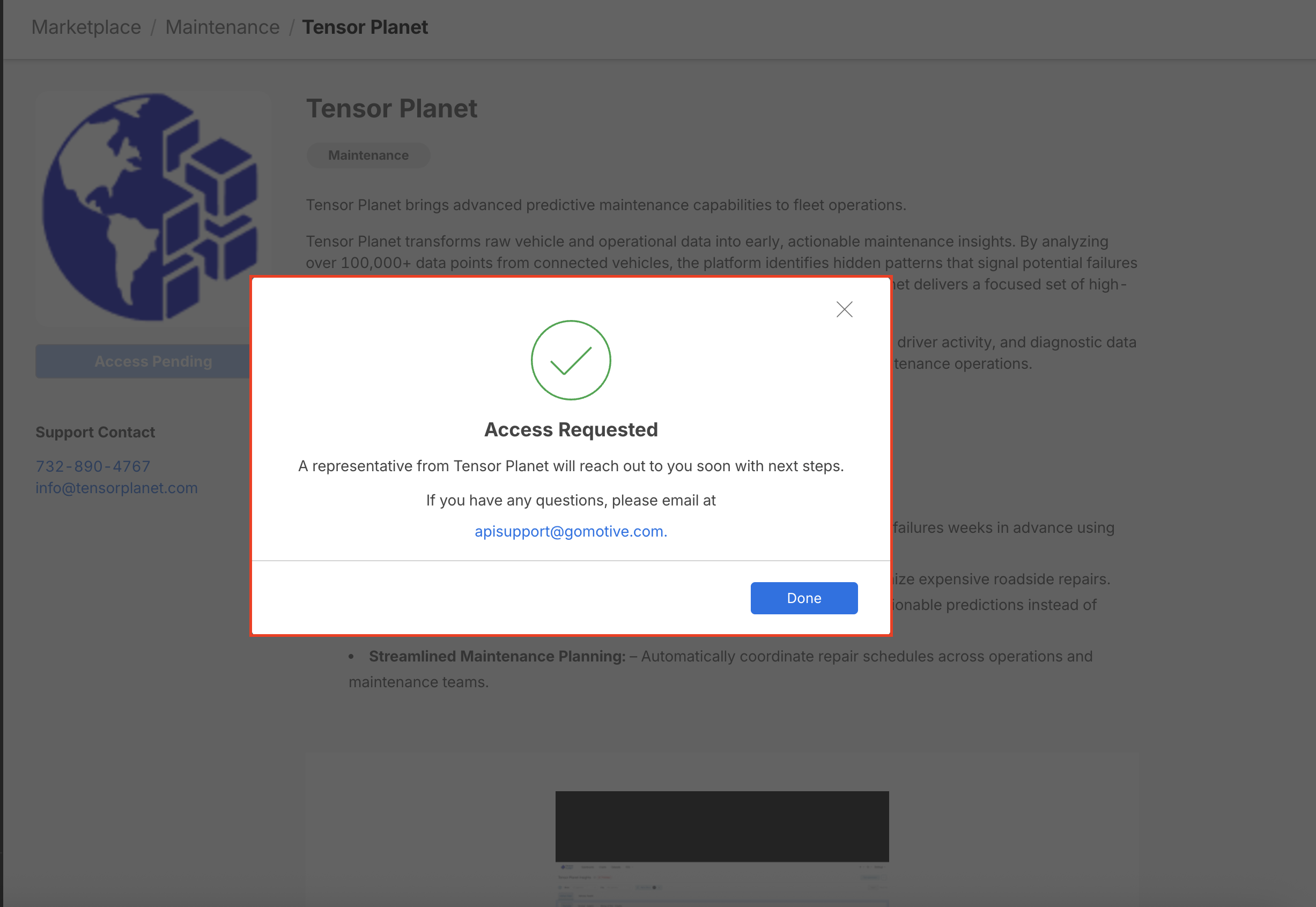 - API Support will then share the API Key with the customer and Must include Tensor Planet support in the cc: partner-support@tensorplanet.com