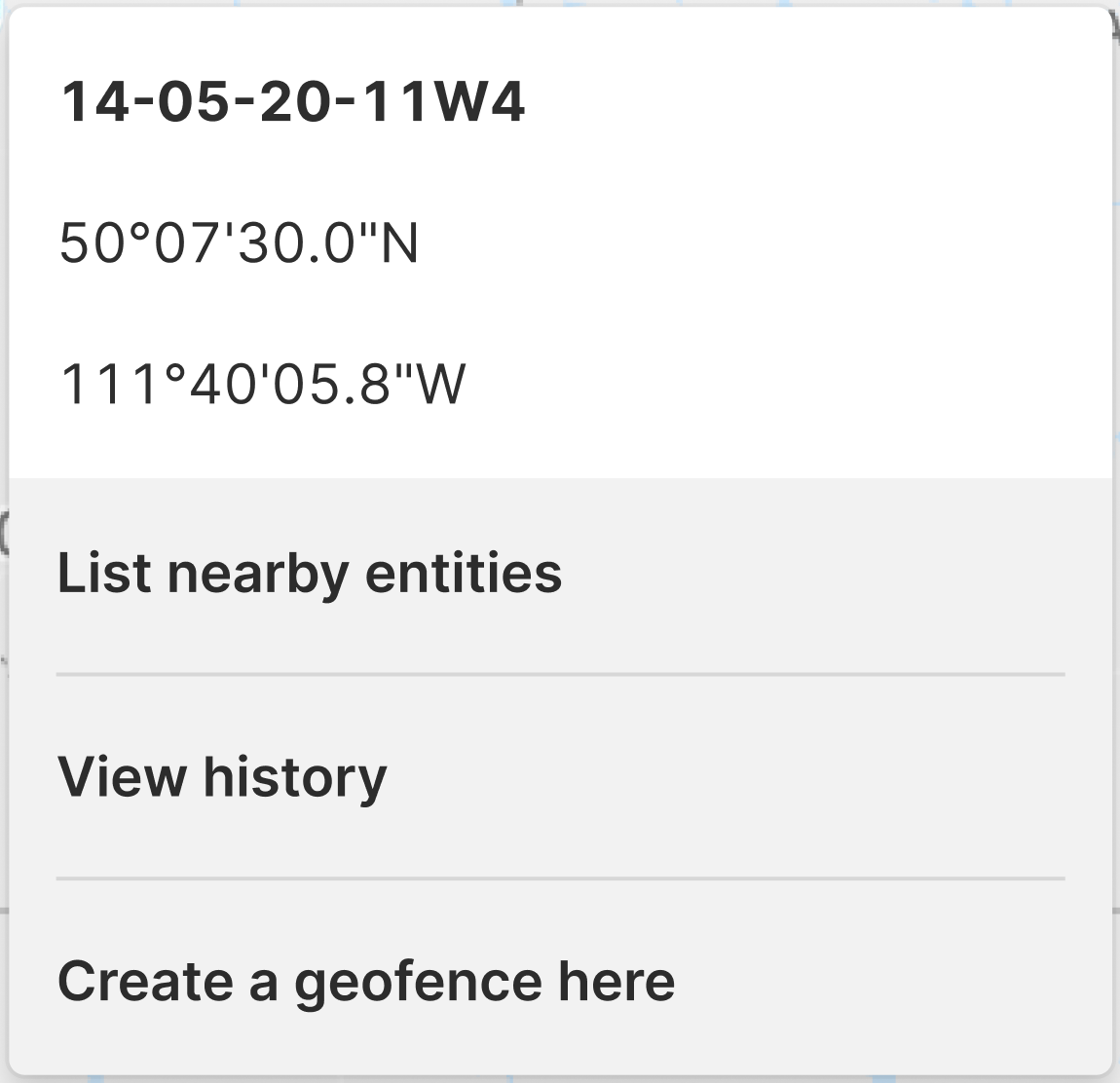 The map zooms in and drops a pin at the center of the LSD. Click the pin to open the context card, which shows the LSD name, geographic coordinates, and the following options: List nearby entities, View history, and Create a geofence here.