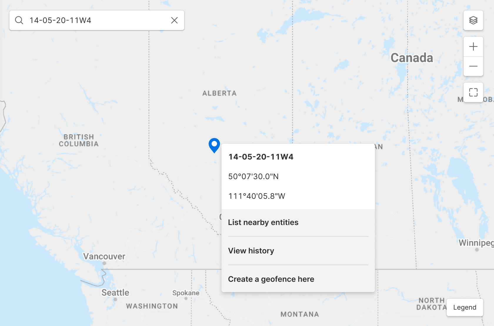 | Note: The search bar accepts leading zeros in most positions. For example, 14-05-020-11-W4 is valid. However, if the format is not recognized as a valid LSD, the search falls back to a standard address search, which may return no results. If you see unexpected results, check the format of your LSD coordinate and try again. |