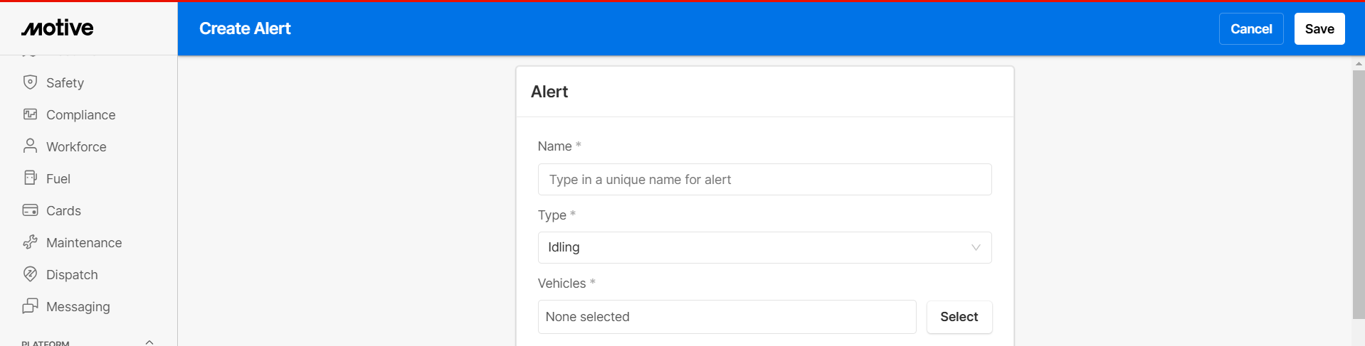 4. In the Alerts Details section, type the Name for the alert and search for Idling from Alert type.