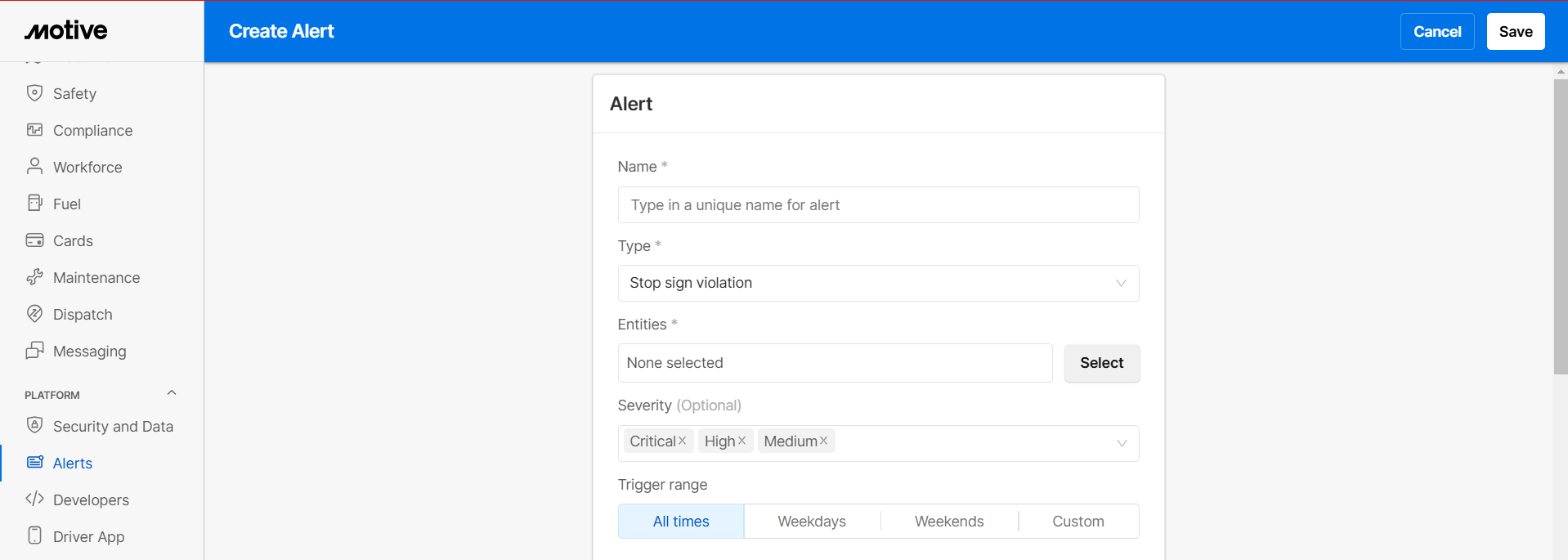 Stop Sign Violation is one of the most dangerous behaviors on the road and can result in accidents. Once the alerts are enabled, Fleet Managers are alerted for every stop sign violation event. Follow the steps below to create stop sign violation alert.