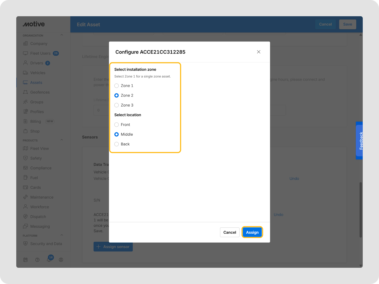 If you haven’t assigned your Environmental Sensor to your Asset Gateway either on the Motive Fleet Dashboard or Motive Fleet App, please do so by following these instructions.