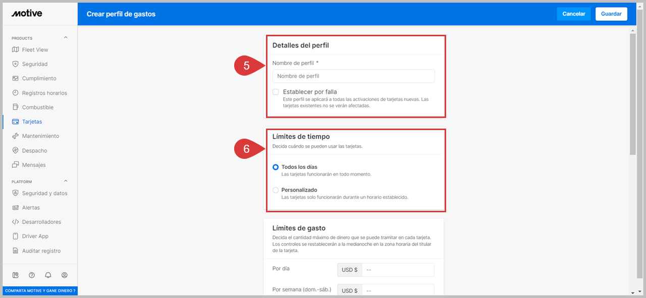 7. Establezca los límites de gasto para su perfil de conductor. Puede establecer límites en función de Por día, Por semana (domingo-sábado), Por mes natural, Por ciclo de facturación o Por transacción.