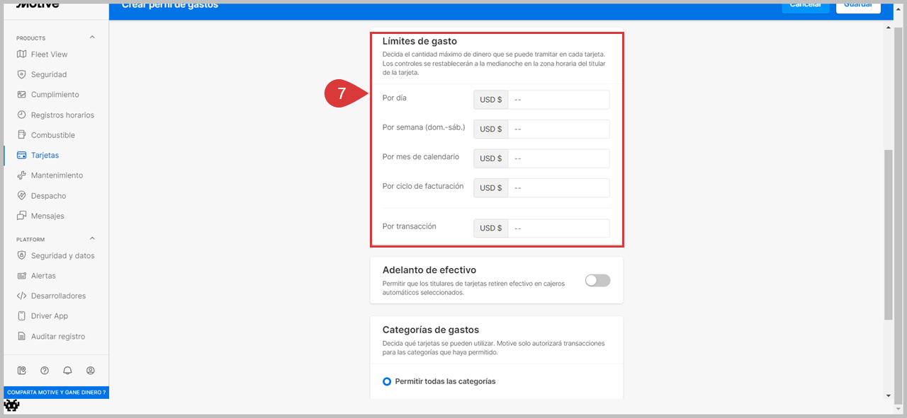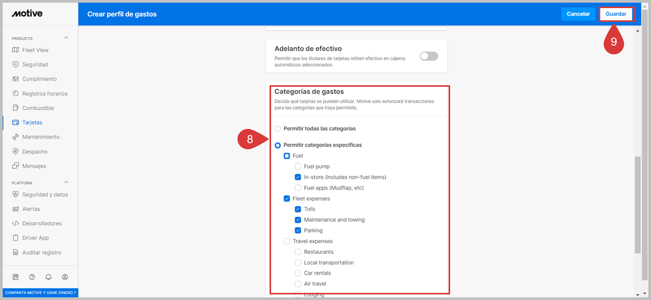8. En las categorías de gasto, puede elegir Permitir todas las categorías o Permitir categorías específicas. Esto establecerá las categorías para las que el conductor puede utilizar la Motive Card.