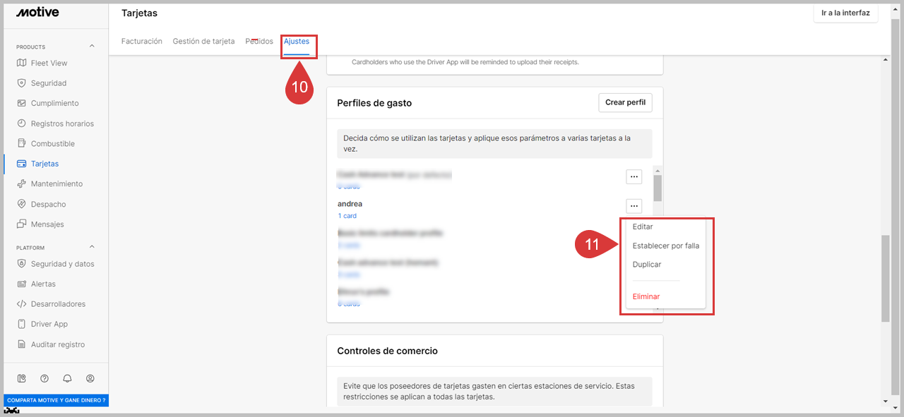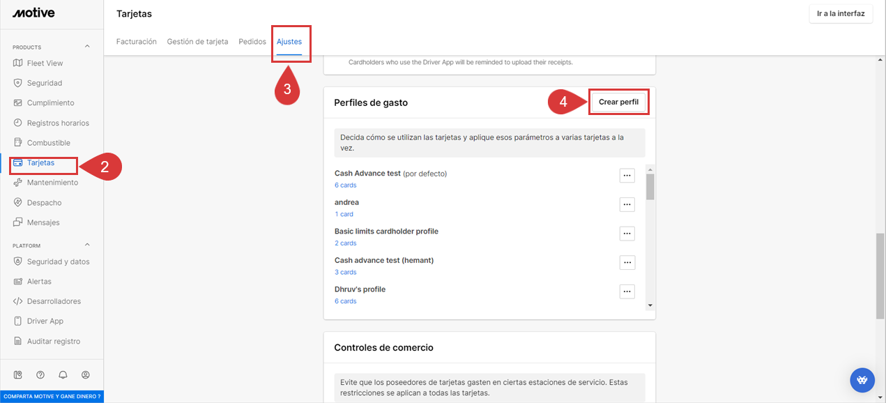Motive permite a los Administradores de Flota configurar perfiles de gastos para todos los conductores o para conductores específicos desde el Panel de Flota de Motive.