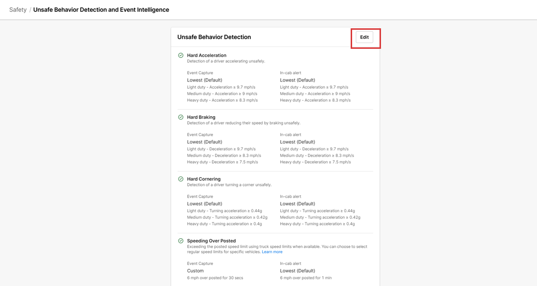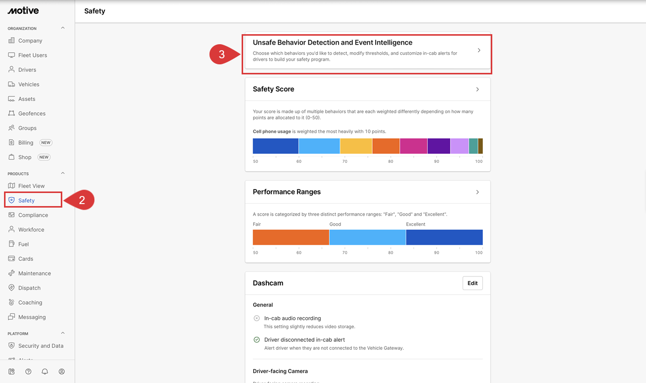 Las alertas en cabina se pueden desactivar ajustando la configuración de seguridad en el Panel de Flota. Este artículo explica los pasos para desactivar las alertas de IA de la Dashcam en cabina usando el Panel de Flota.