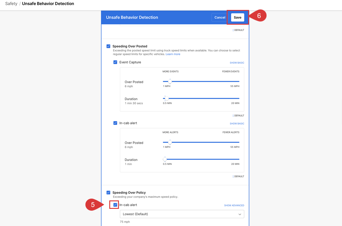 5. Desmarque la sección Alerta en cabina en los eventos de seguridad requeridos para desactivar las alertas en cabina.