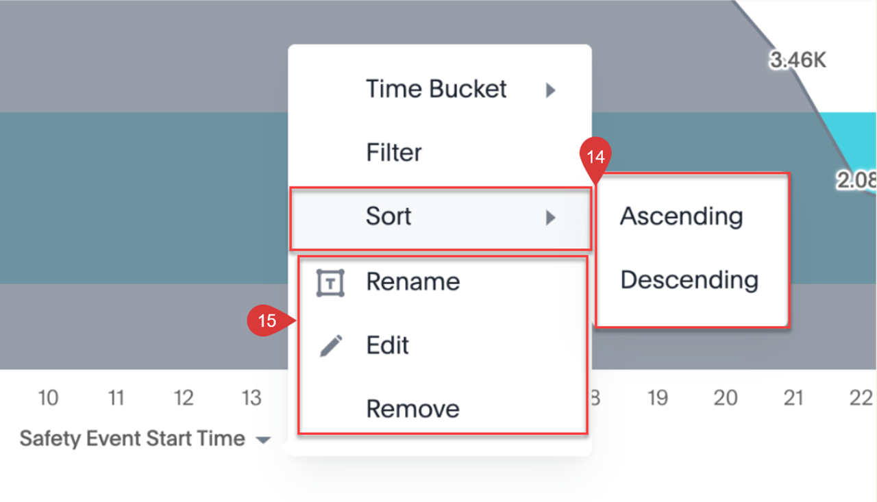 14. Seleccione la opción Ordenar en el menú del eje, y elige una alternativa de la lista de opciones: Ascendente o Descendente.
