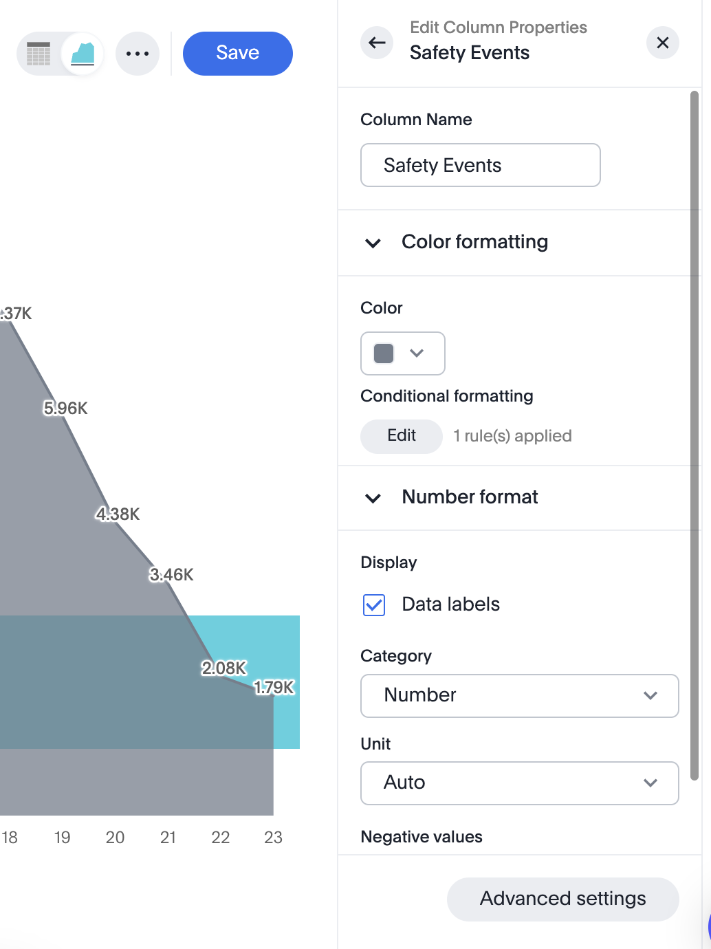 - Unidad: Elige cómo se muestran los números — Automático, Ninguno, Mil (K), Millón (M), Mil Millones (B) o Billón (T).