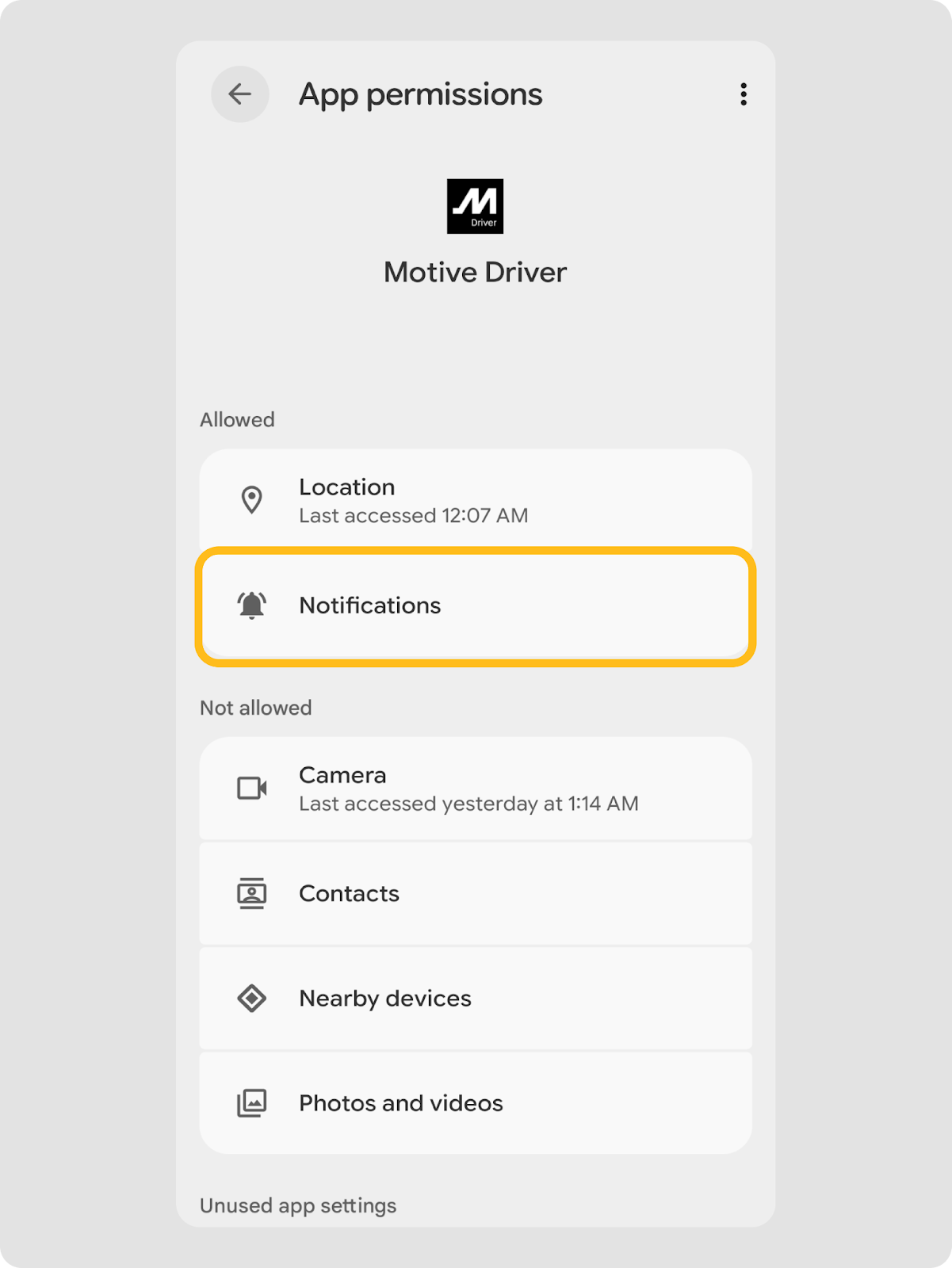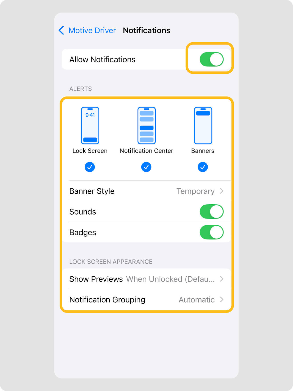 Asegúrese de que las notificaciones estén habilitadas tanto en su dispositivo como en la configuración de la Aplicación para Conductores Motive.