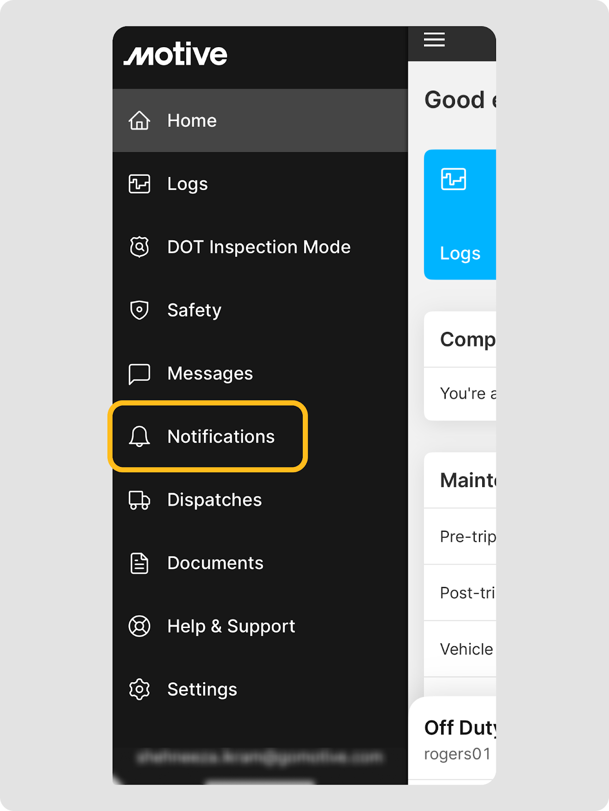 - En la Aplicación para Conductores Motive, vaya a Menú > Notificaciones.