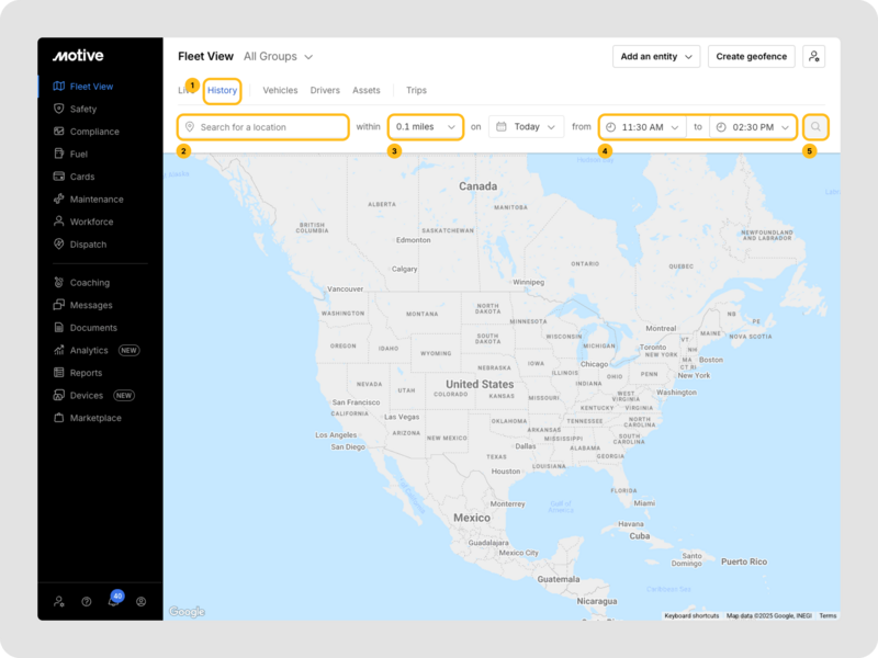 La función de búsqueda de actividad histórica en Motive te permite encontrar y revisar rápidamente la actividad pasada de vehículos y conductores basada en ubicación y tiempo. Esto es esencial para una respuesta efectiva a incidentes, análisis de rutas y verificación de cumplimiento.