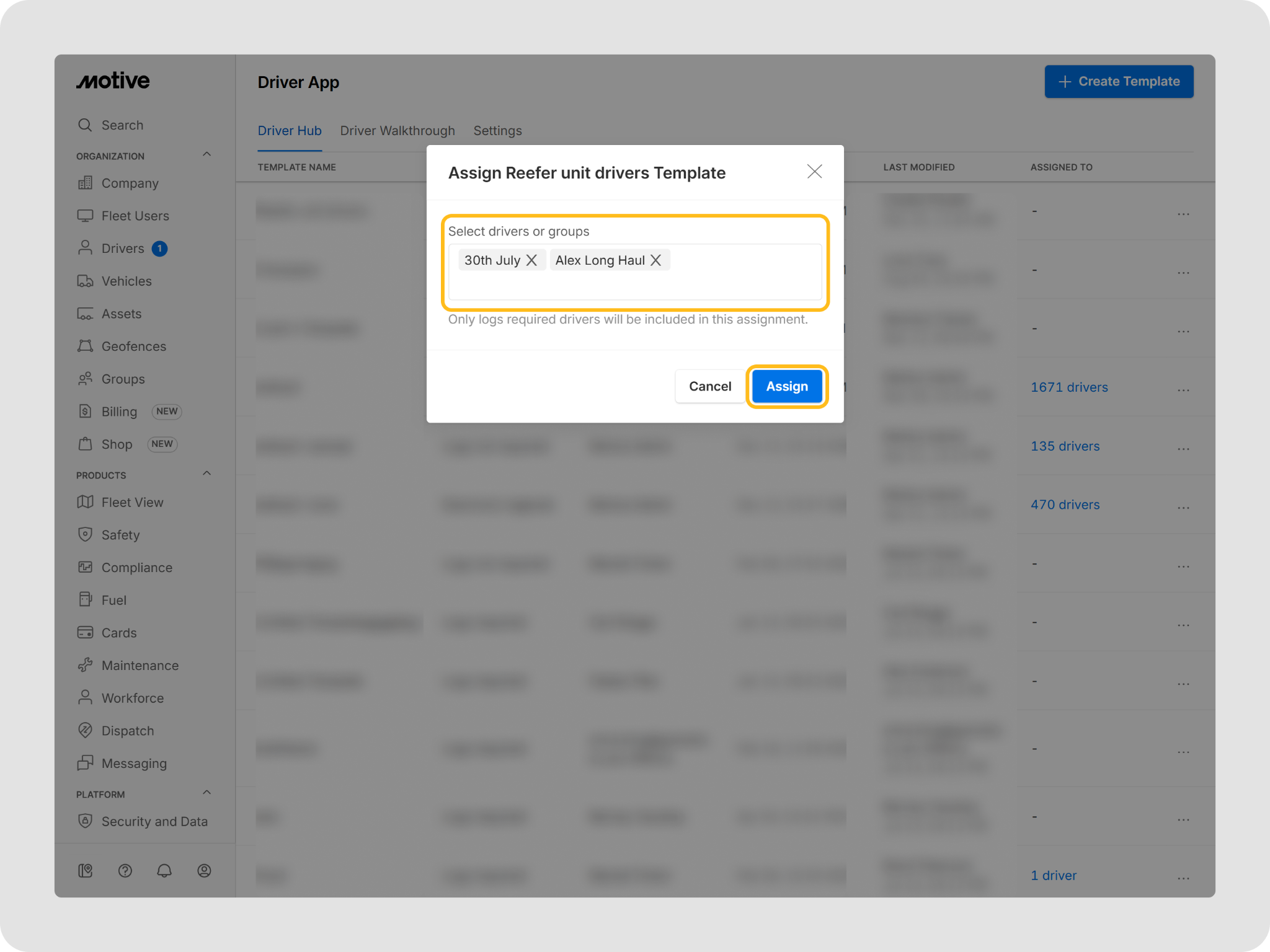 - Haz clic en Asignar una vez que hayas seleccionado todos los conductores y grupos a los que deseas asignar esta plantilla.