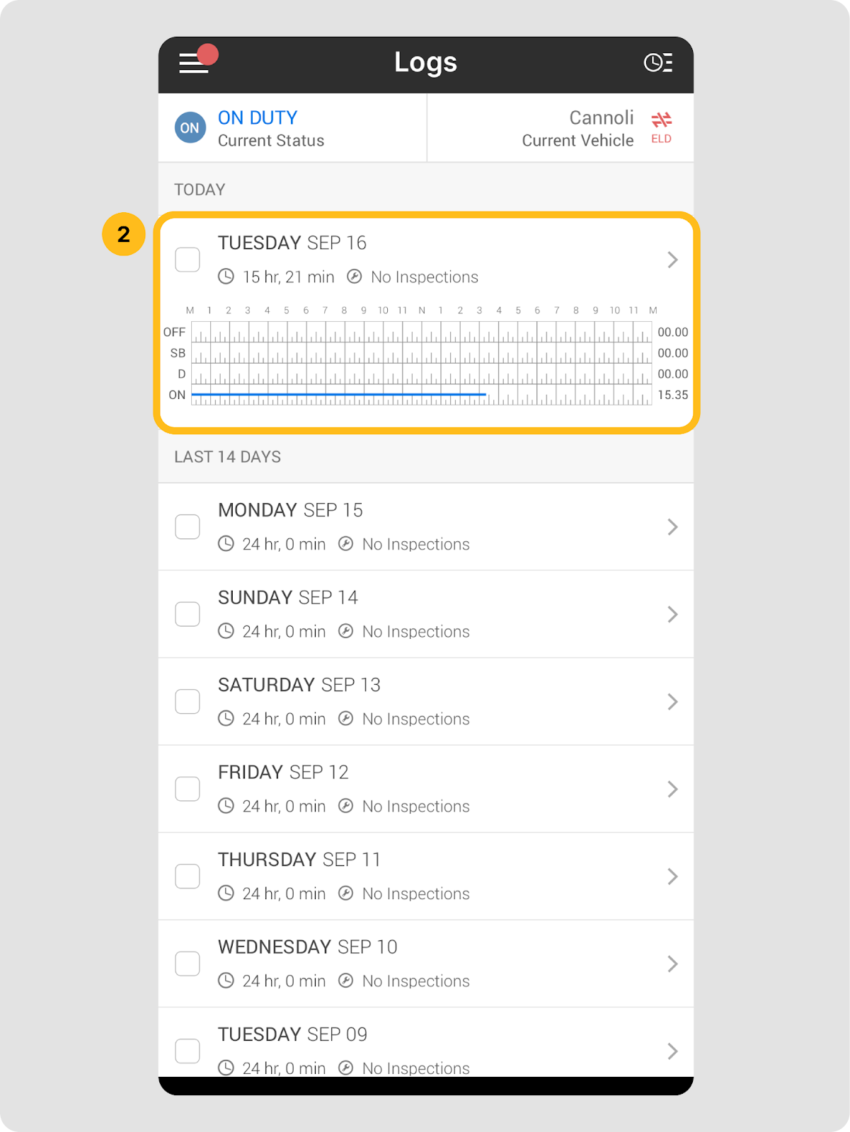 Cambia al Modo de Inspección DOT en la aplicación para mostrar o transferir tus registros.