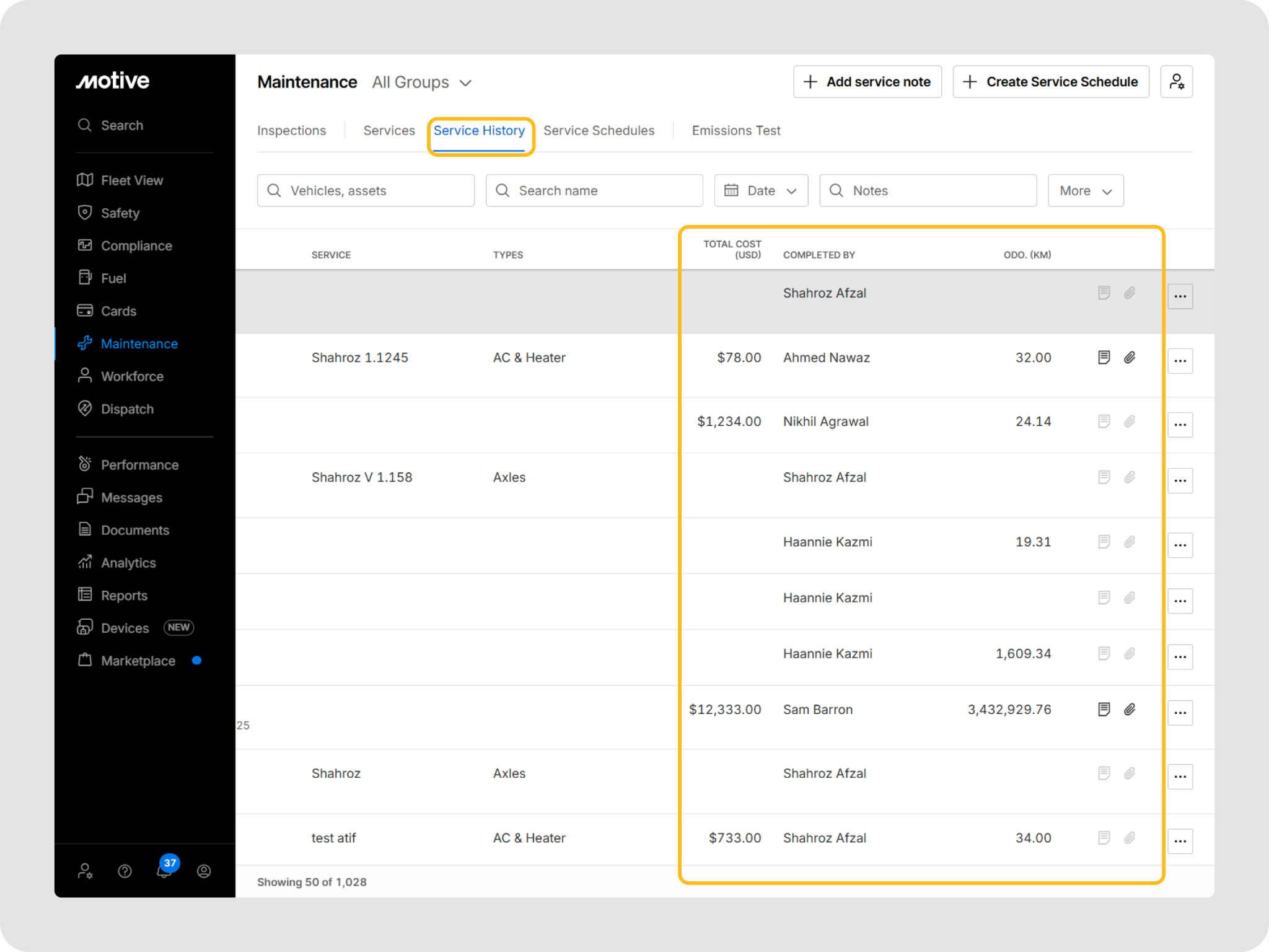 Para ver los registros de mantenimiento pasados de su flota, navegue a Mantenimiento > Historial de Servicio. Use el desplazamiento horizontal para ver todos los datos técnicos y documentación de cada registro.