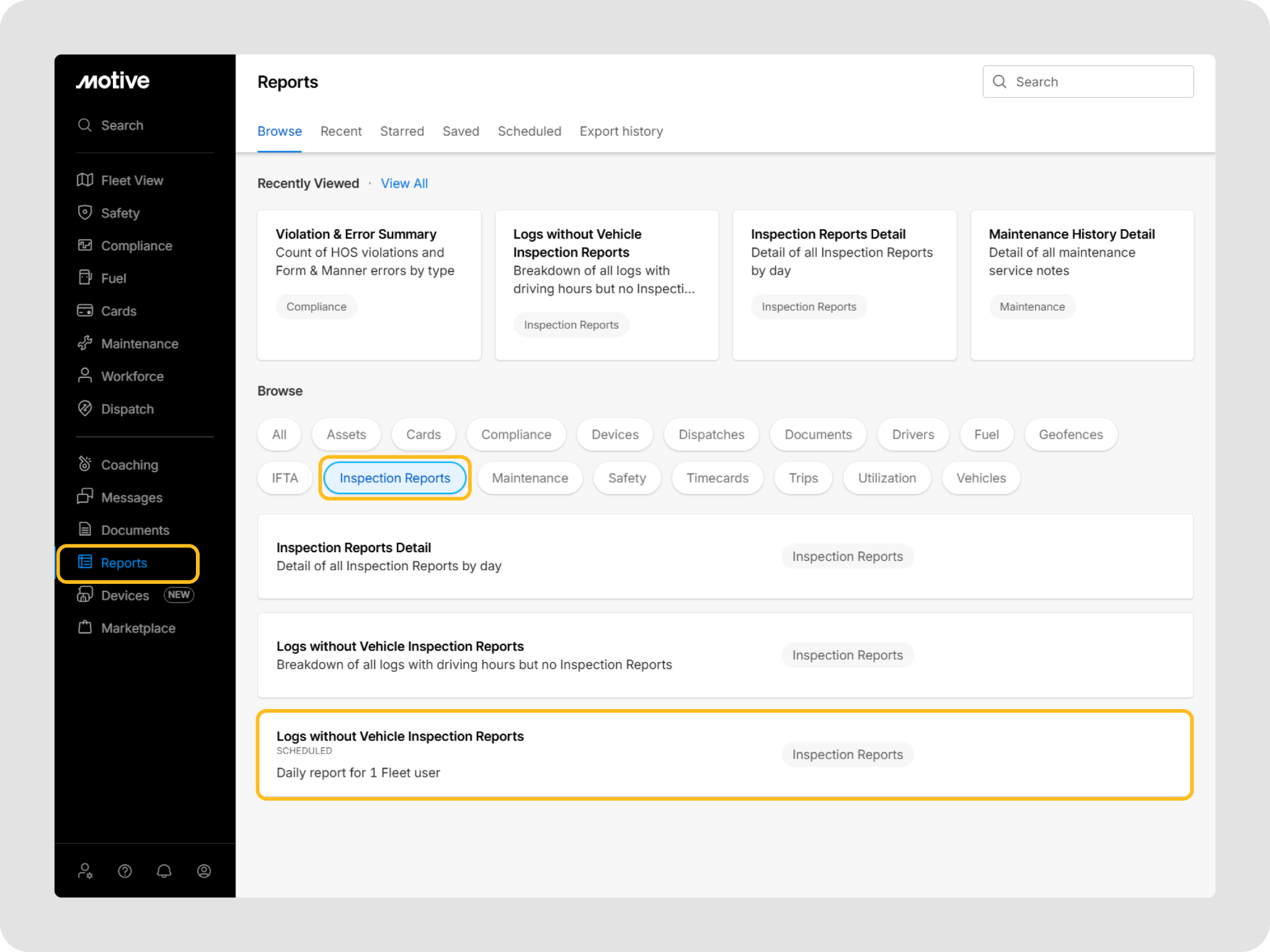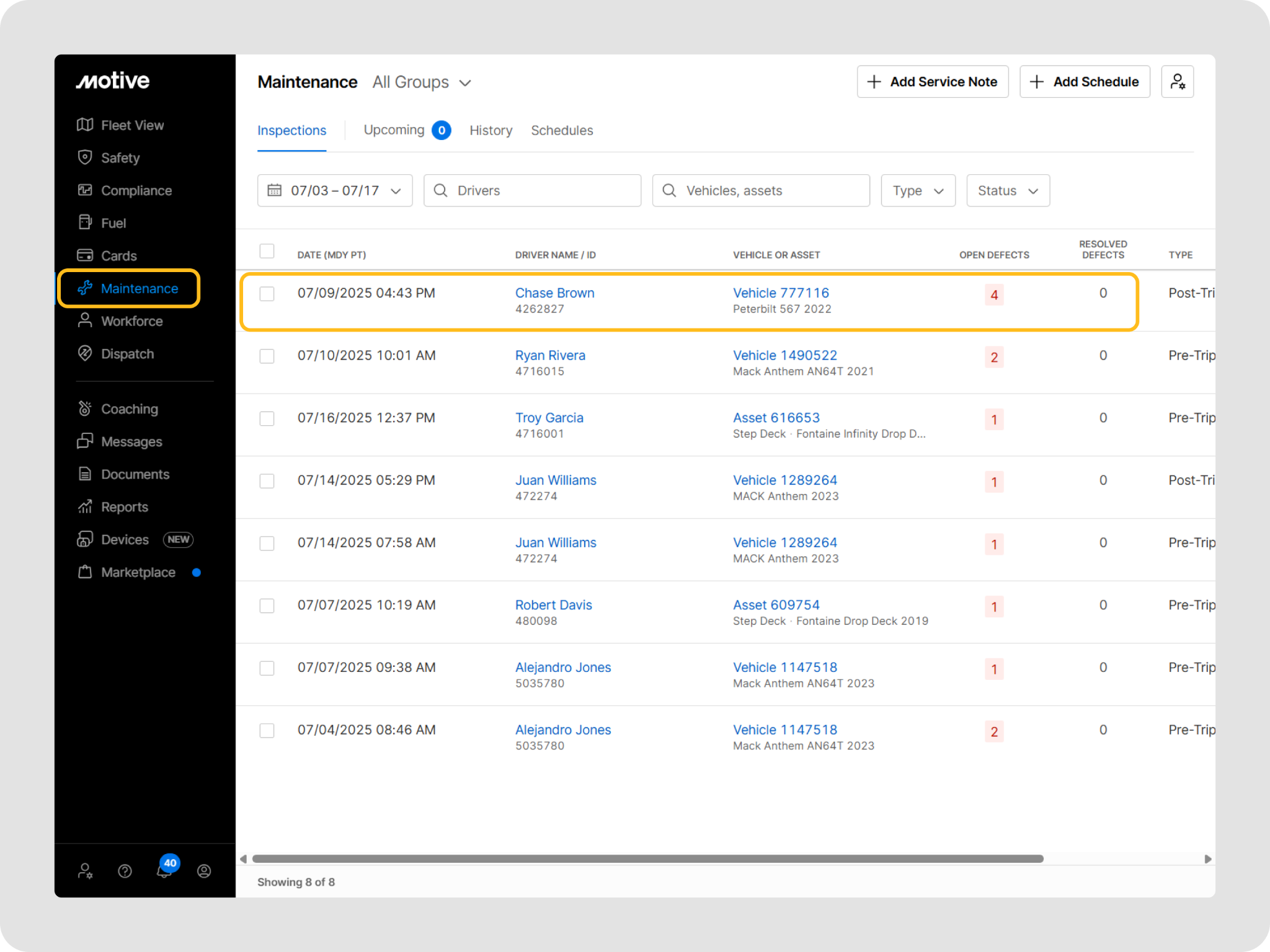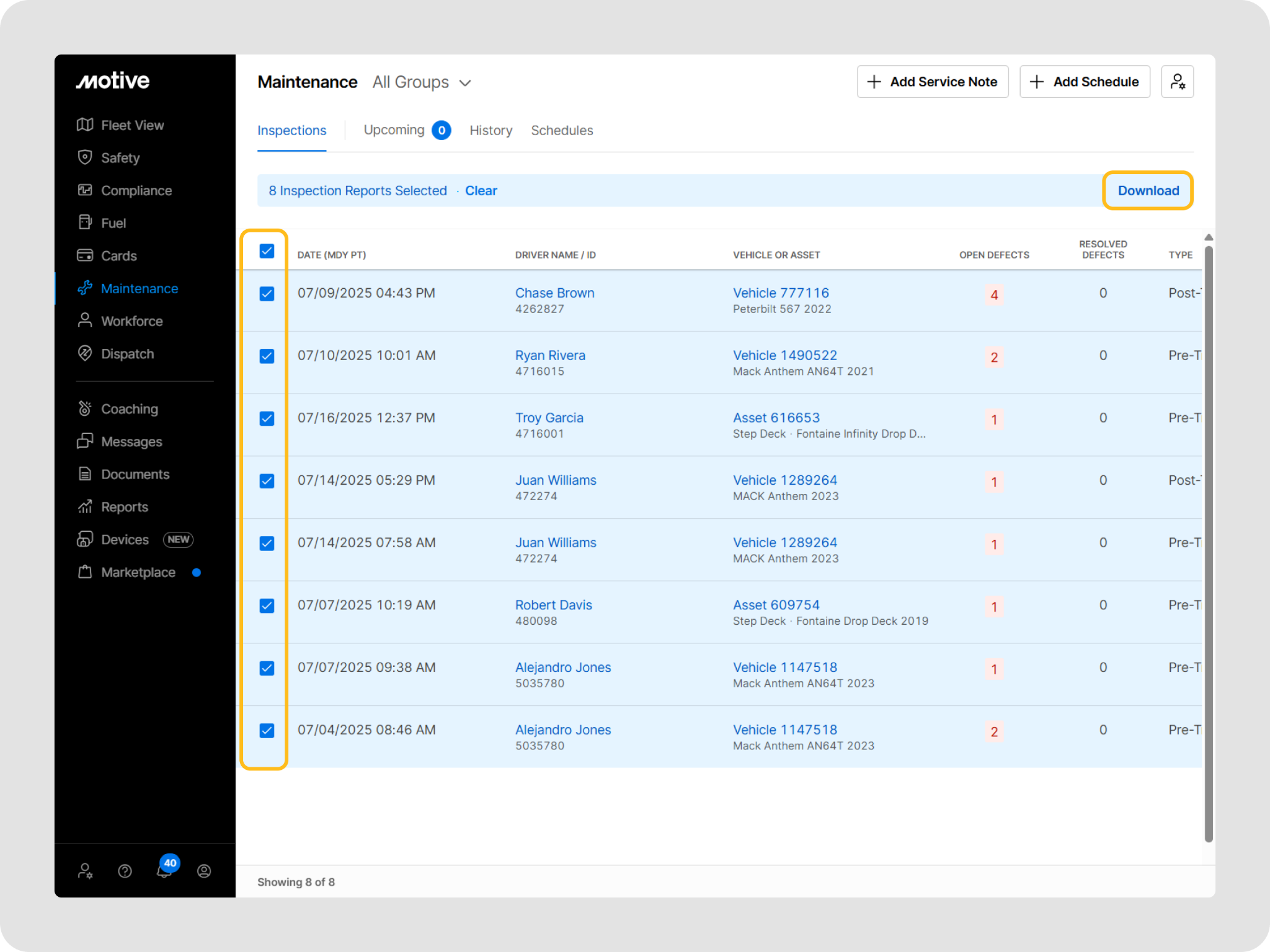 Motive ofrece análisis robustos y notificaciones en tiempo real para inspecciones y mantenimiento, ayudándole a mantener el rendimiento y cumplimiento de la flota. Ya sea que necesite informes detallados o alertas instantáneas, Motive le proporciona las herramientas para mantener sus vehículos funcionando de manera segura y eficiente.