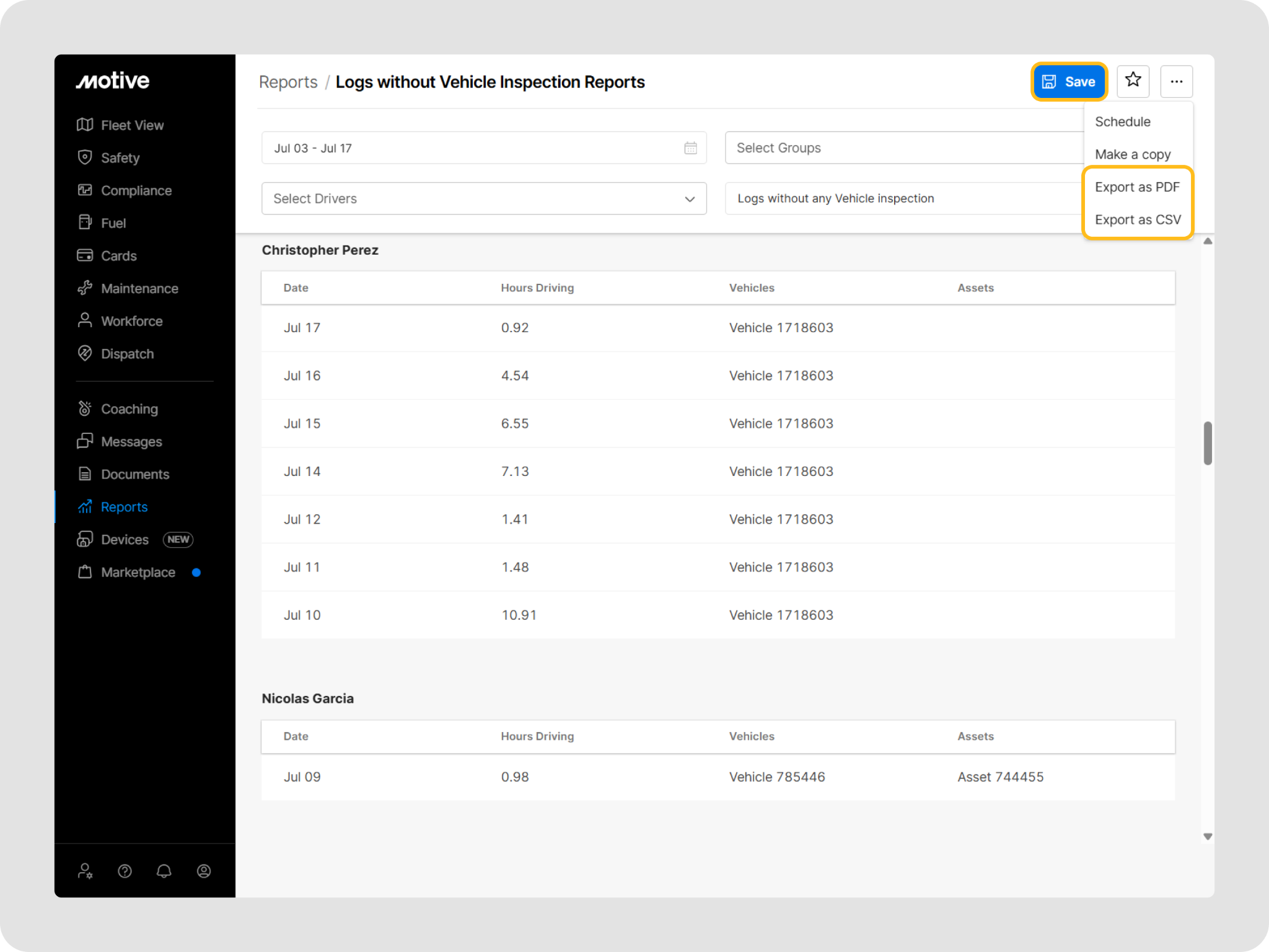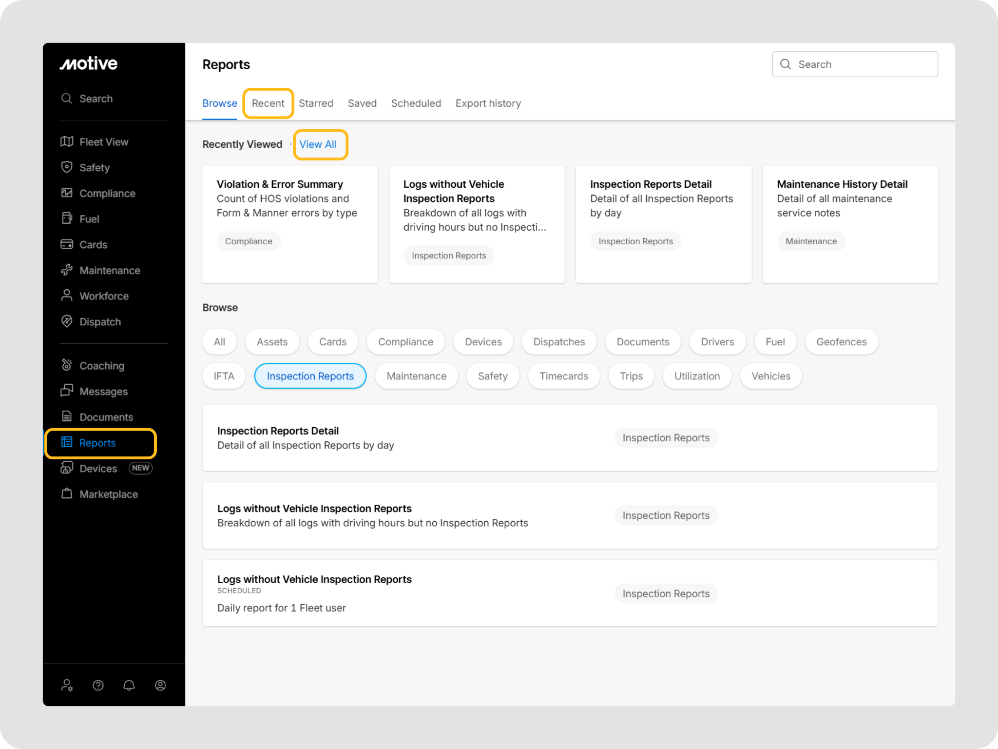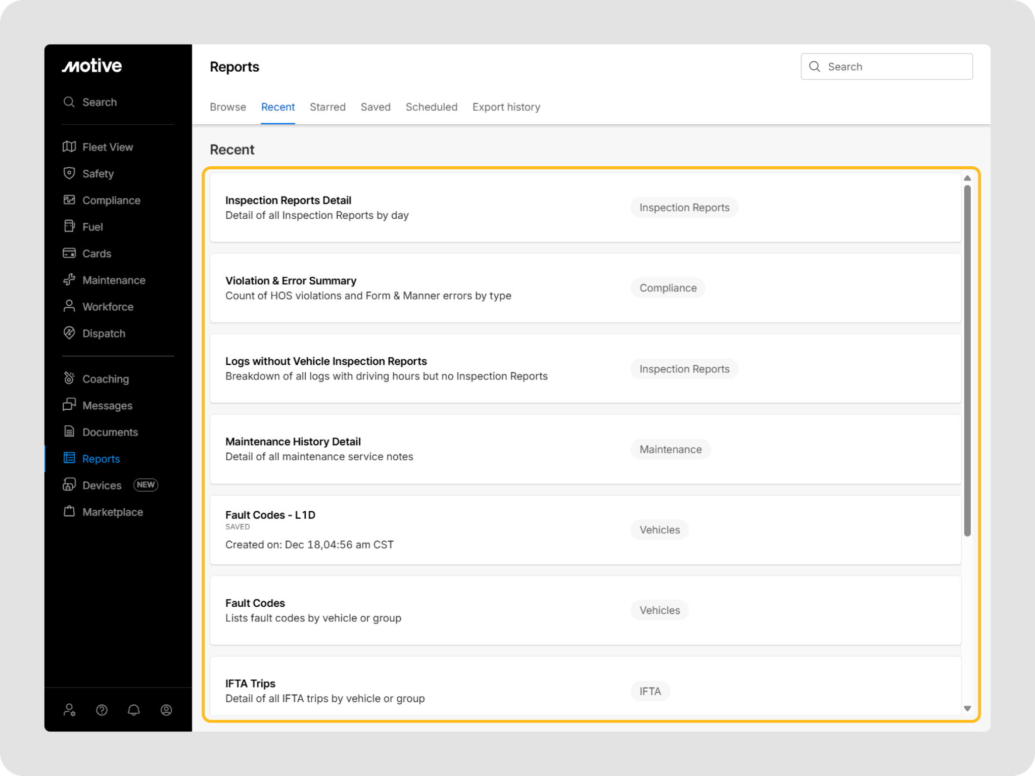 Motive ofrece análisis robustos y notificaciones en tiempo real para inspecciones y mantenimiento, ayudándole a mantener el rendimiento y cumplimiento de la flota. Ya sea que necesite informes detallados o alertas instantáneas, Motive le proporciona las herramientas para mantener sus vehículos funcionando de manera segura y eficiente.