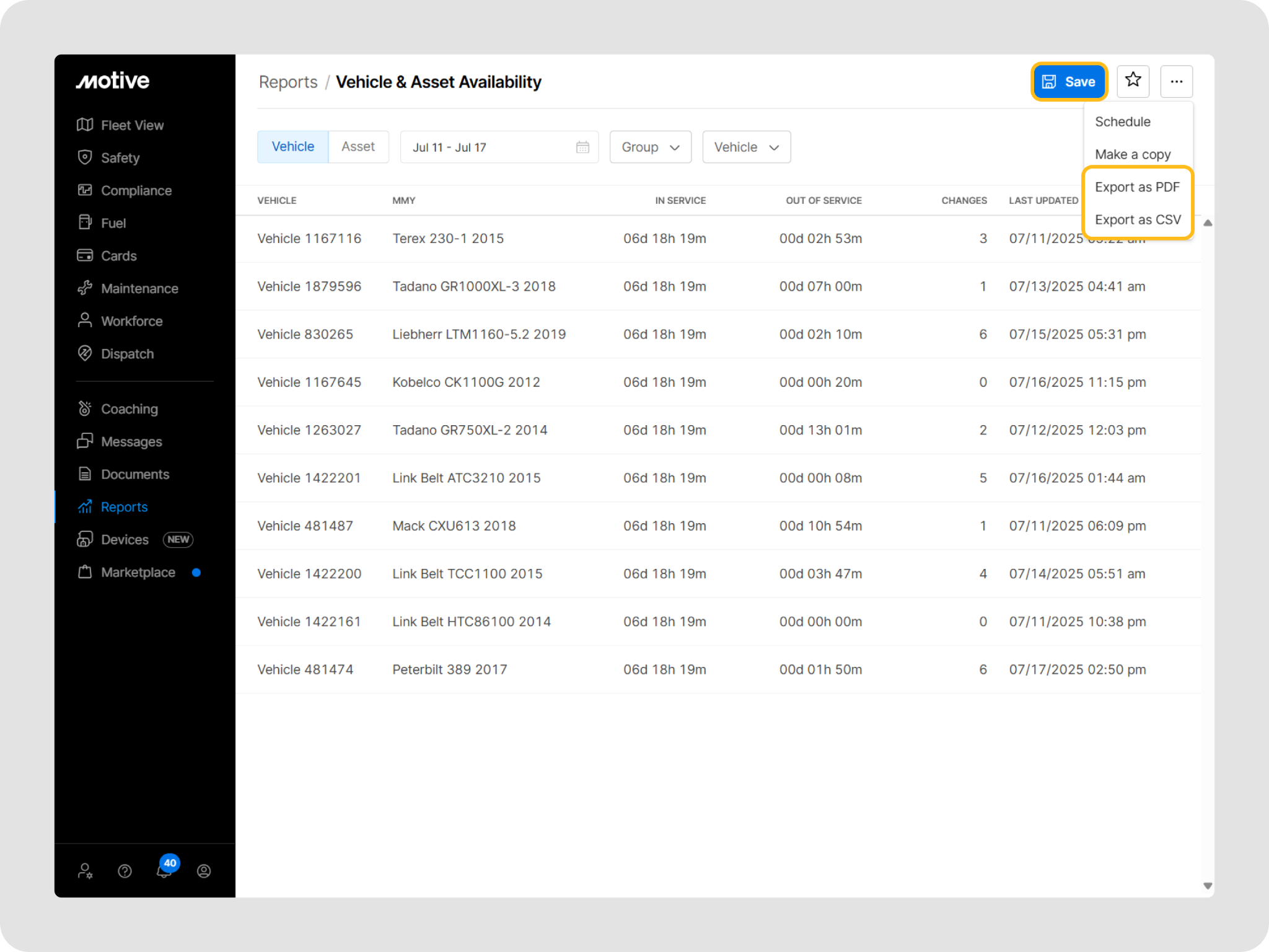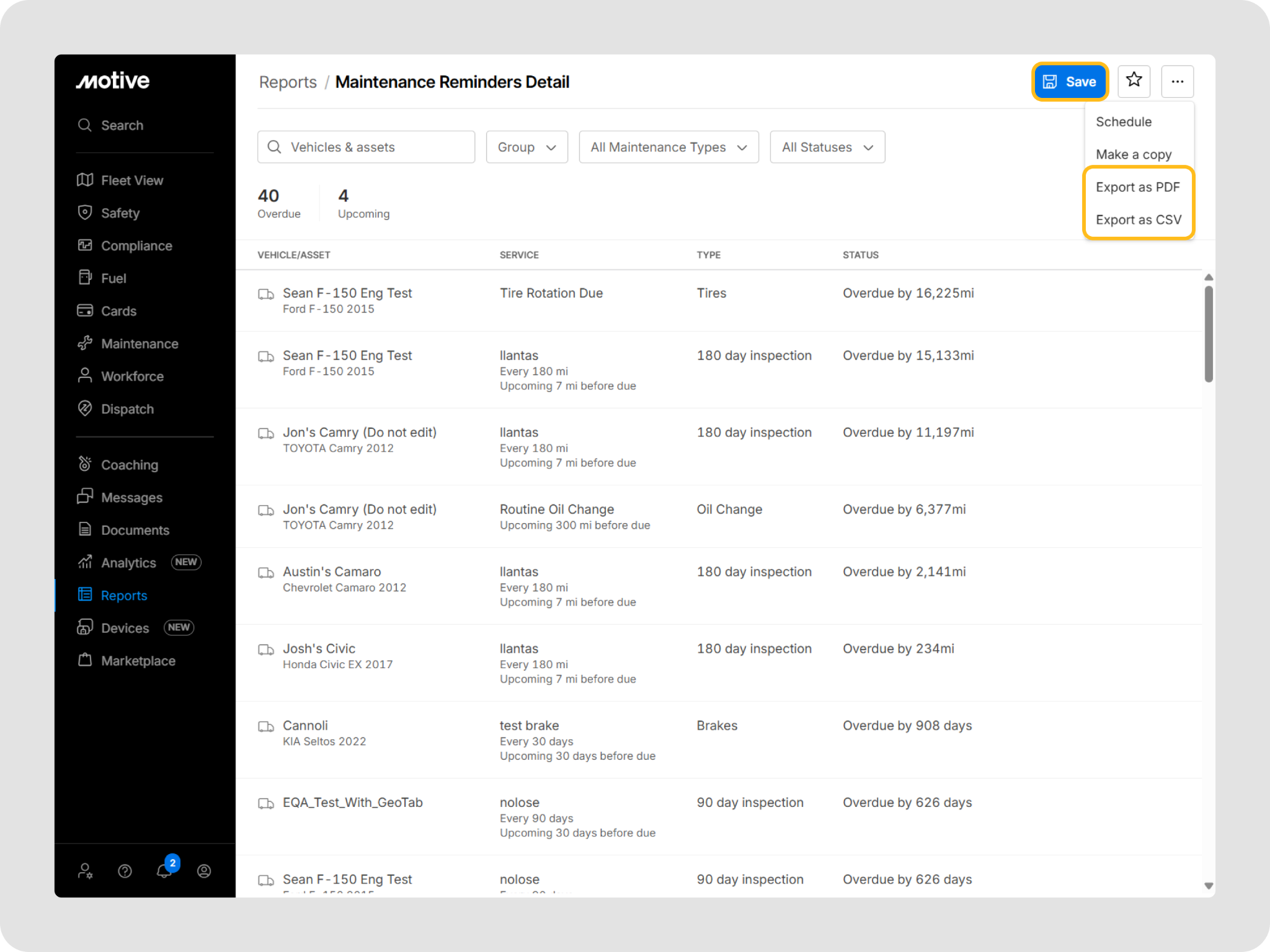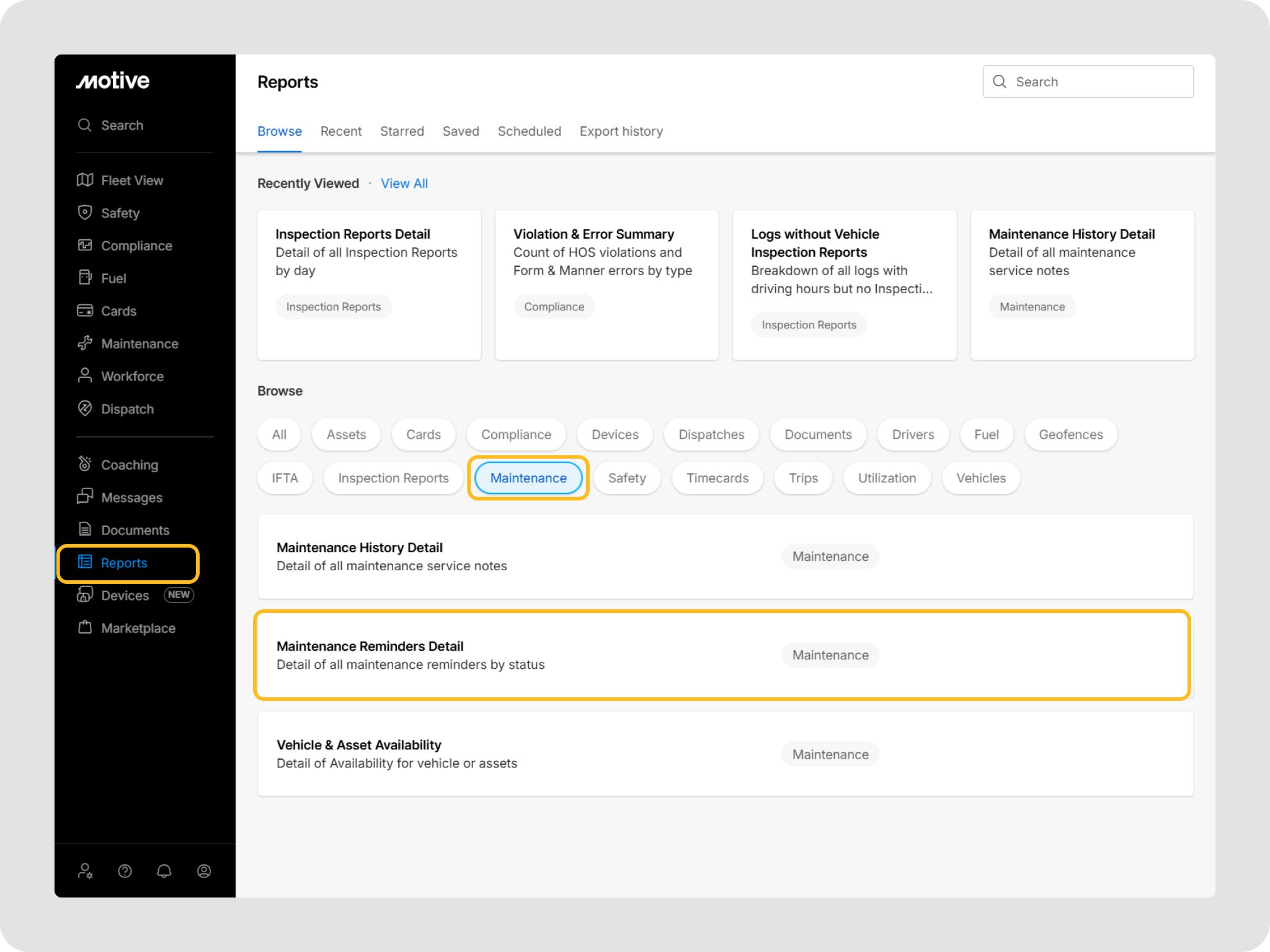 Los informes de mantenimiento solo están habilitados para clientes con un plan de suscripción Pro o superior. Si no los ve, comuníquese con su representante de Motive para confirmar su plan y acceso a funciones.