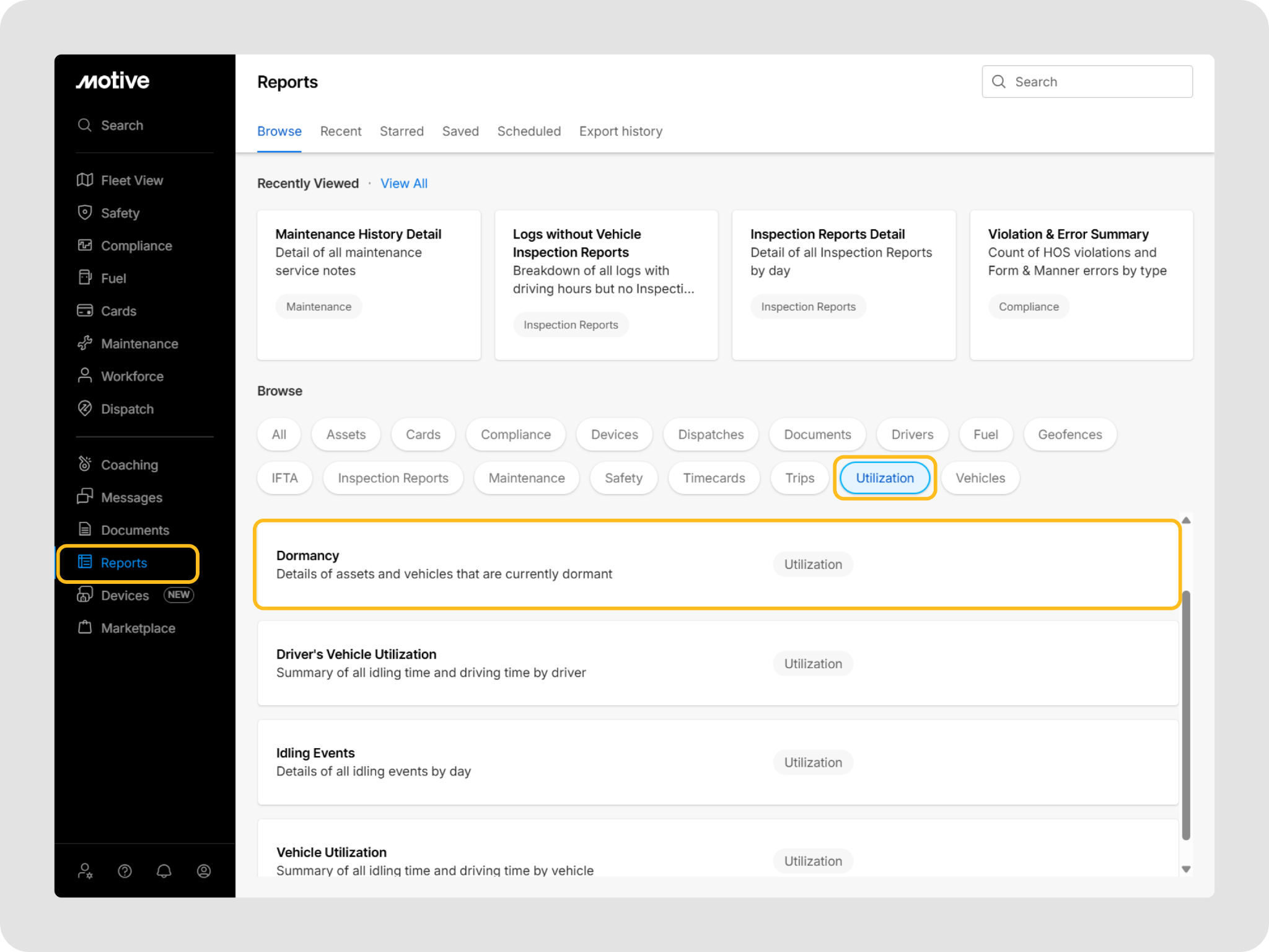 - Inicie sesión en el Motive Fleet Dashboard y vaya a Informes.