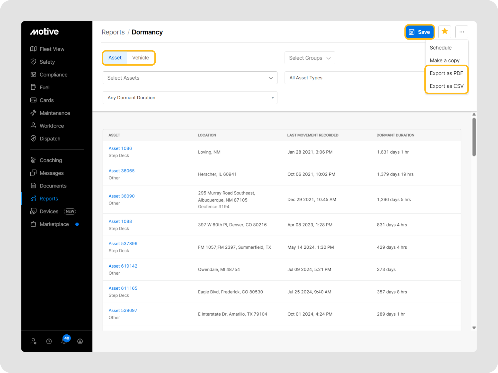 - Cambie entre la pestaña Activo o Vehículo para acceder a informes de inactividad de ambos.